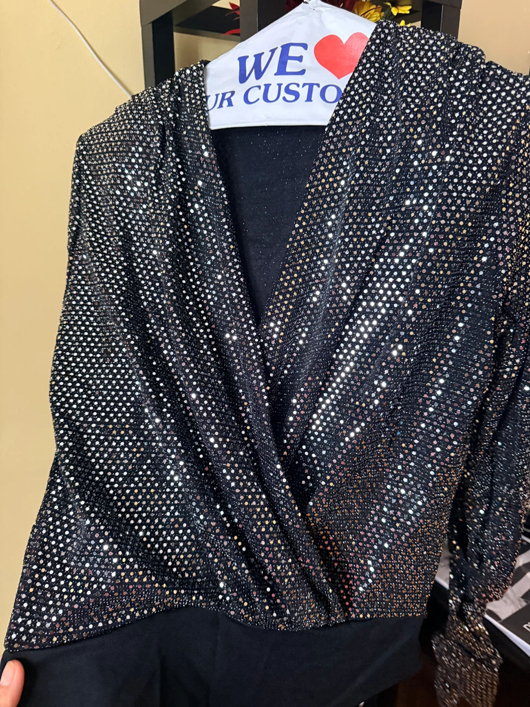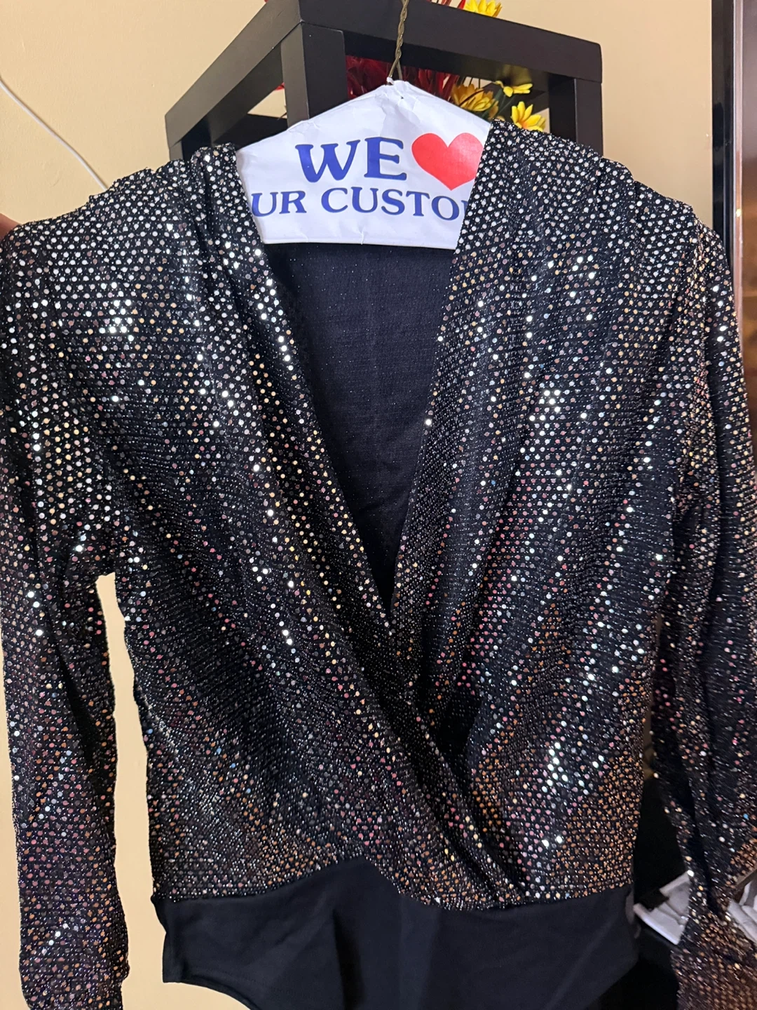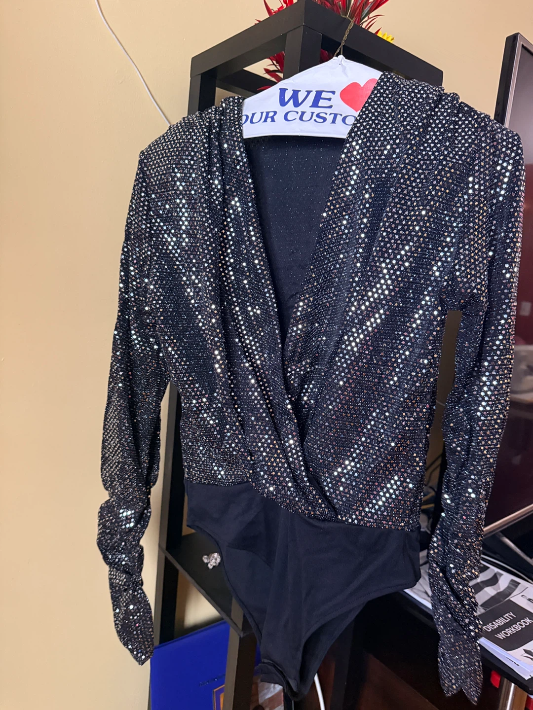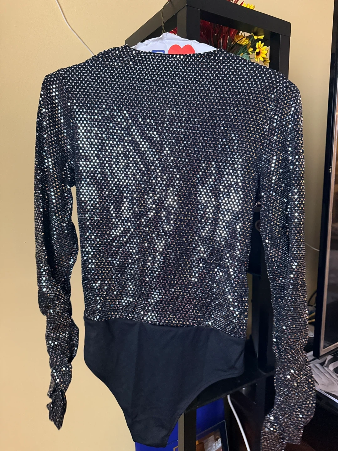 Here's a sparkly black bodysuit. It's in great condition and ready for a night out or a fun event! The fabric has a nice shimmer, and the bodysuit design is super flattering