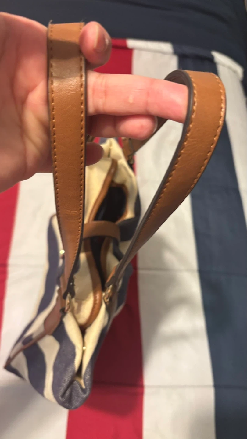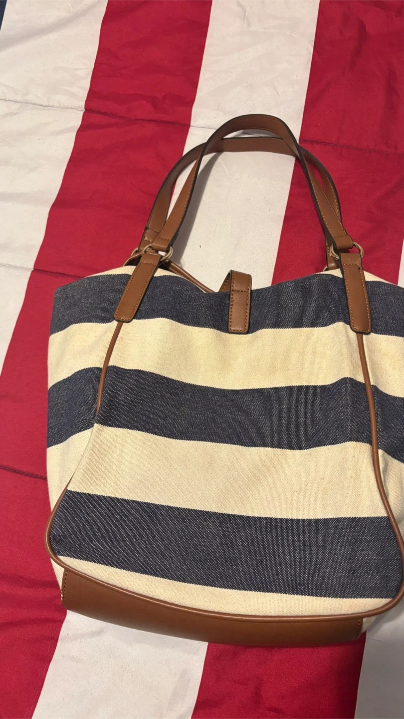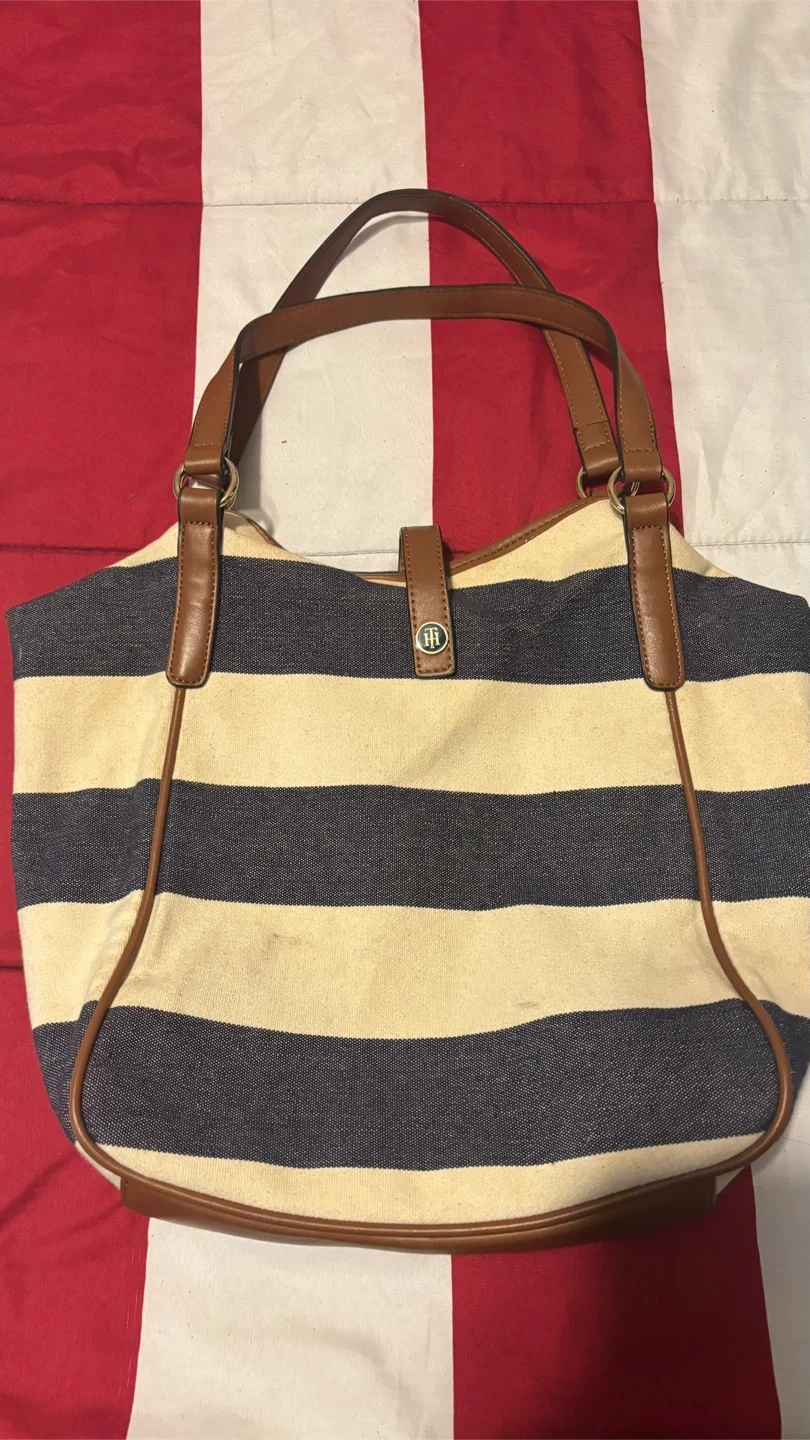 Tommy Hilfiger tote bag with a striped design! It features brown leather accents and handles, with a navy blue interior. Great for everyday use