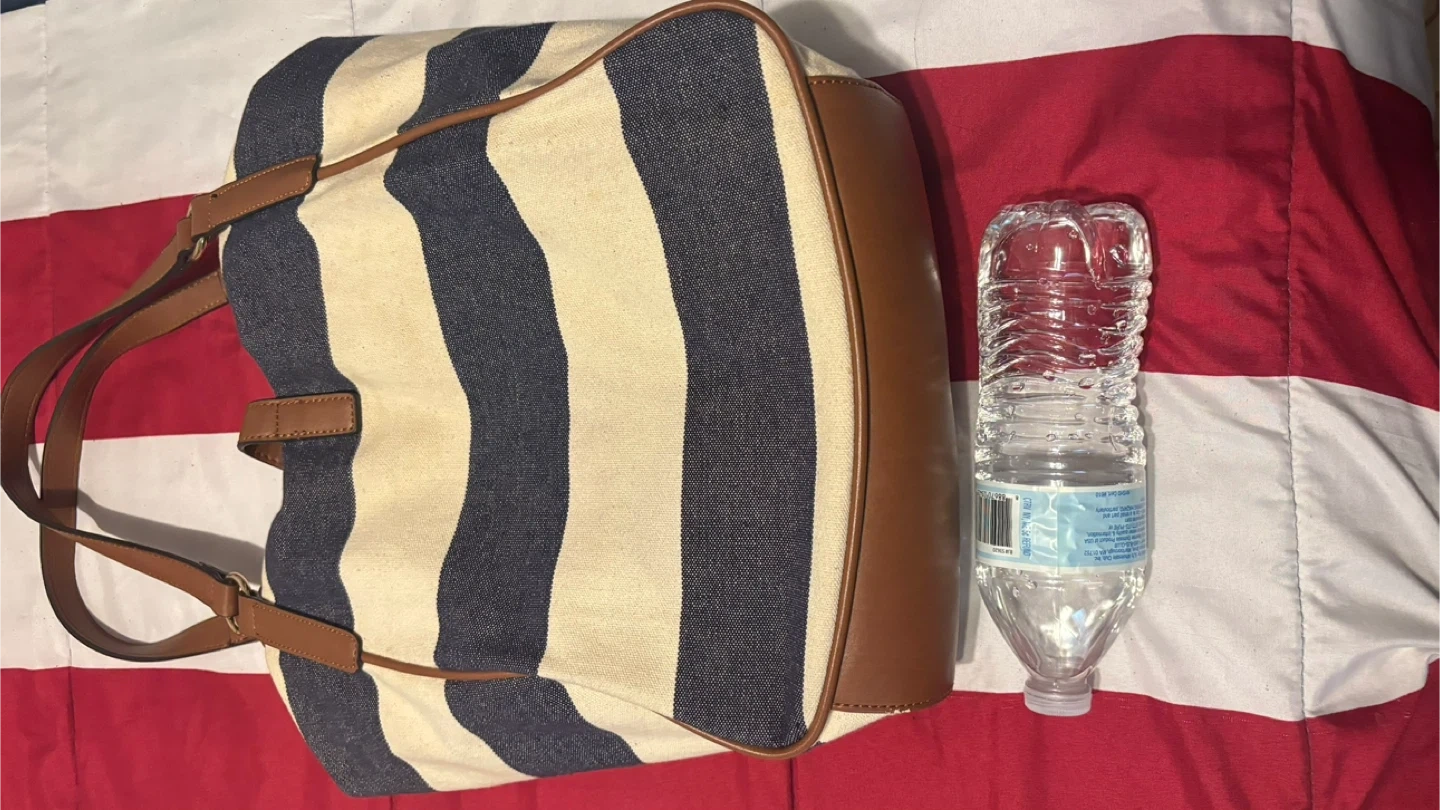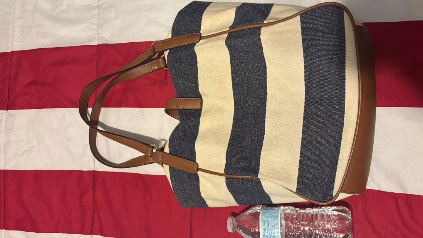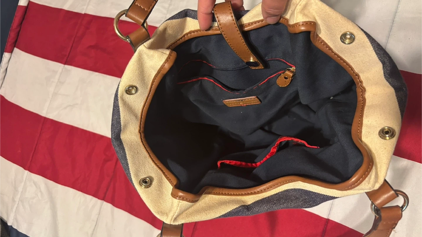 Tommy Hilfiger tote bag with a striped design! It features brown leather accents and handles, with a navy blue interior. Great for everyday use