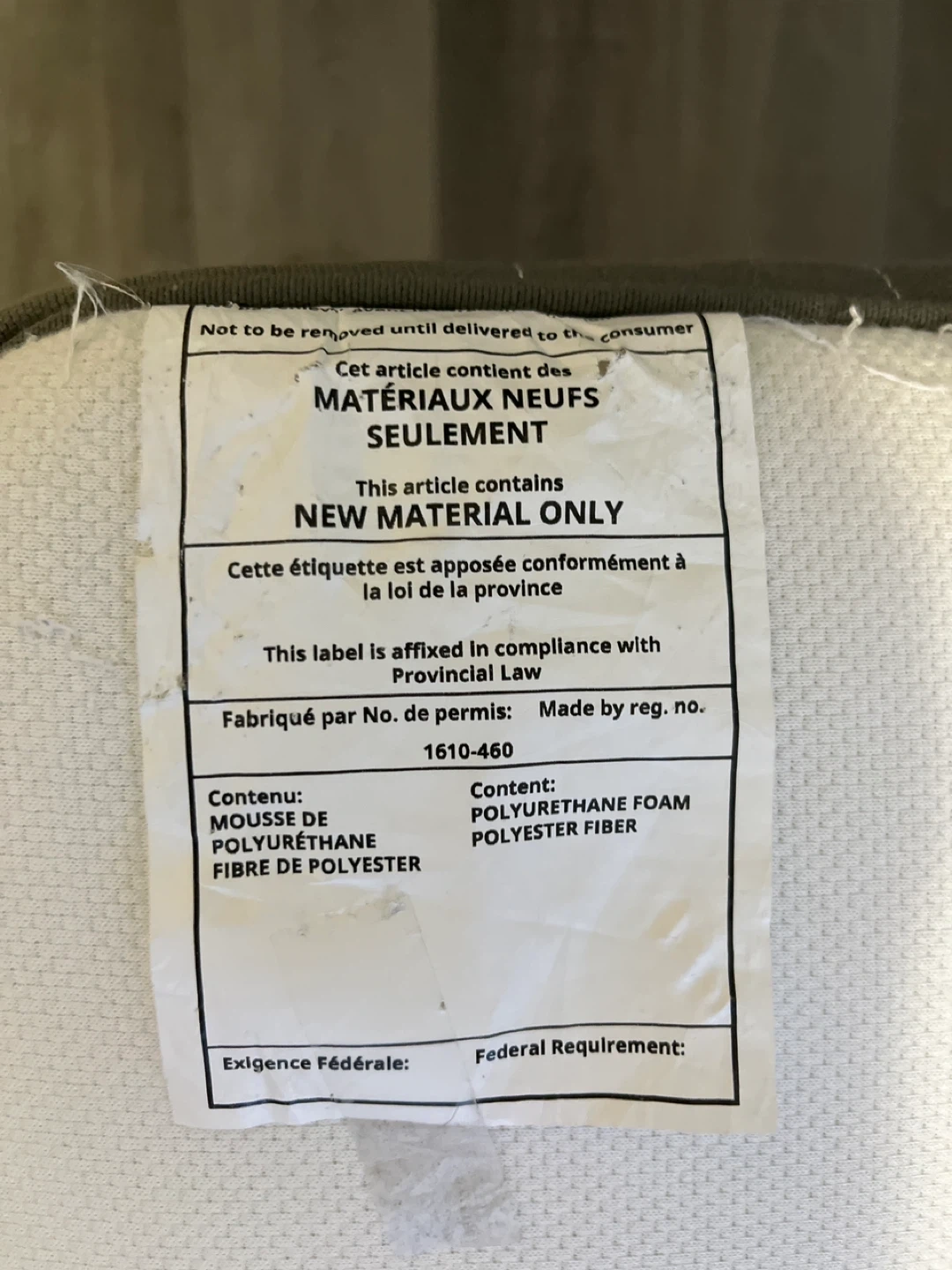 The label shows it contains polyurethane foam and polyester fiber.