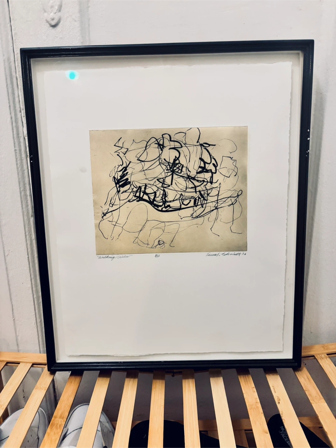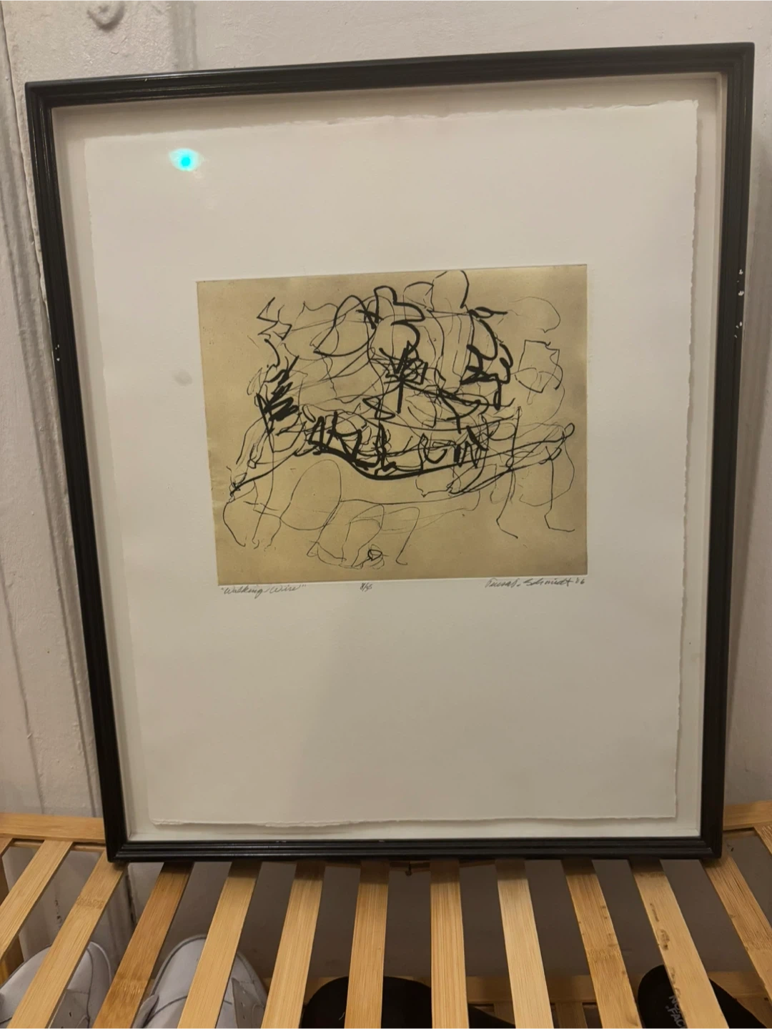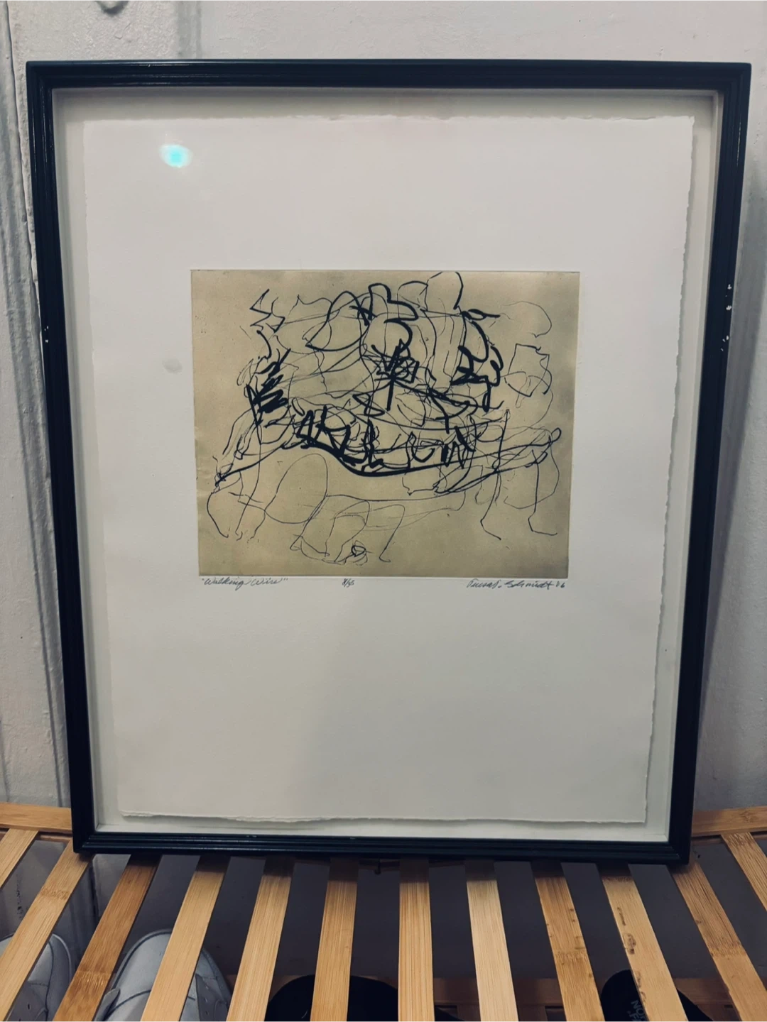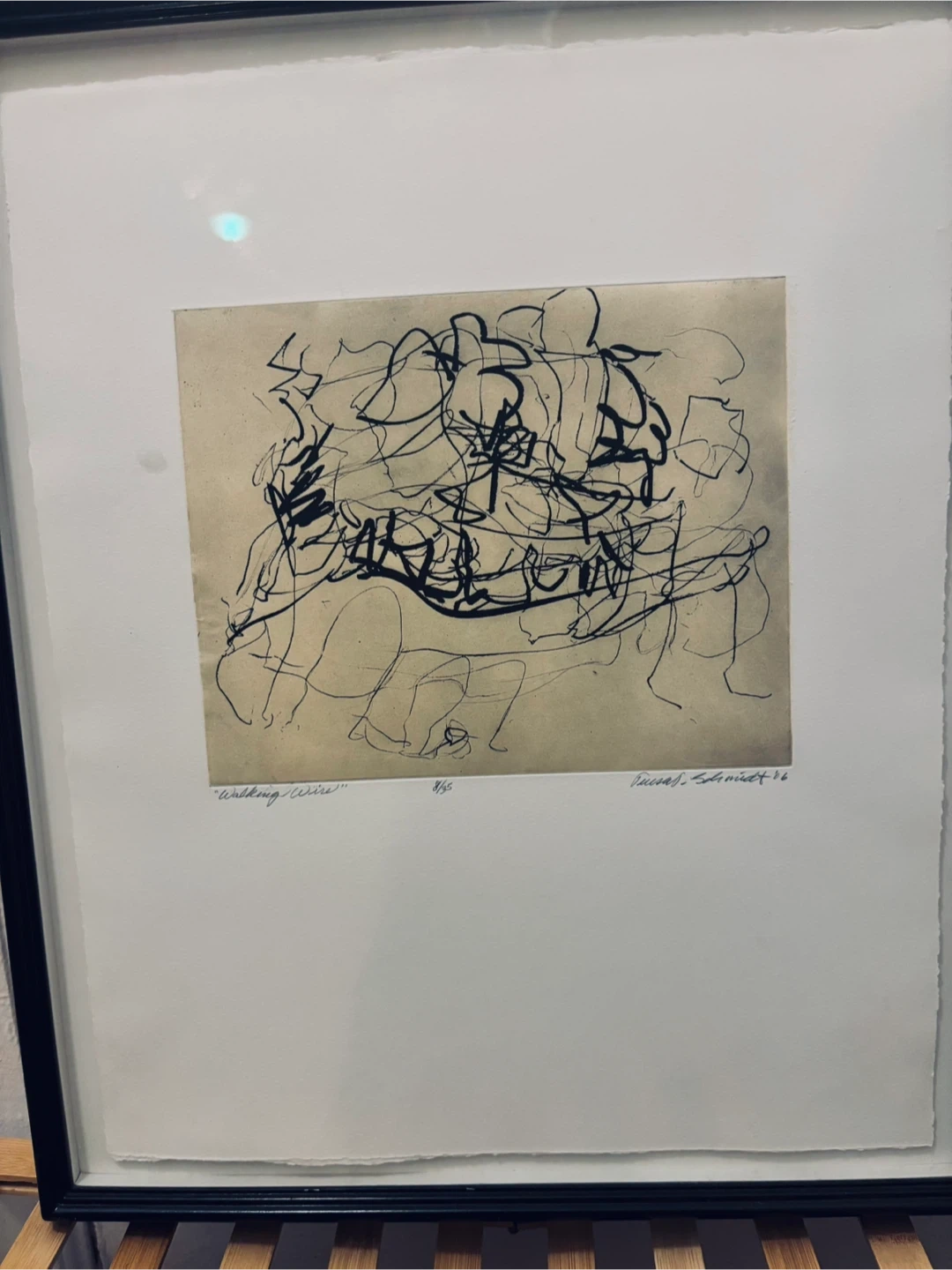Framed art print featuring an abstract design. The piece is signed by the artist, "Schmidt '06”and titled "Walking wire”. Ready to hang and add a touch of modern art to your space