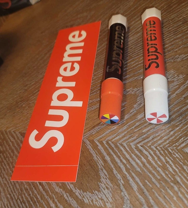 2-pack of Supreme Hand Mixed Paint Sticks. Each fade-resistant, waterproof permanent marker features Supreme branding on the body. Price is firm. Comes with Supreme sticker. Pickup in Milton but Mississauga near sq1 can be arranged.