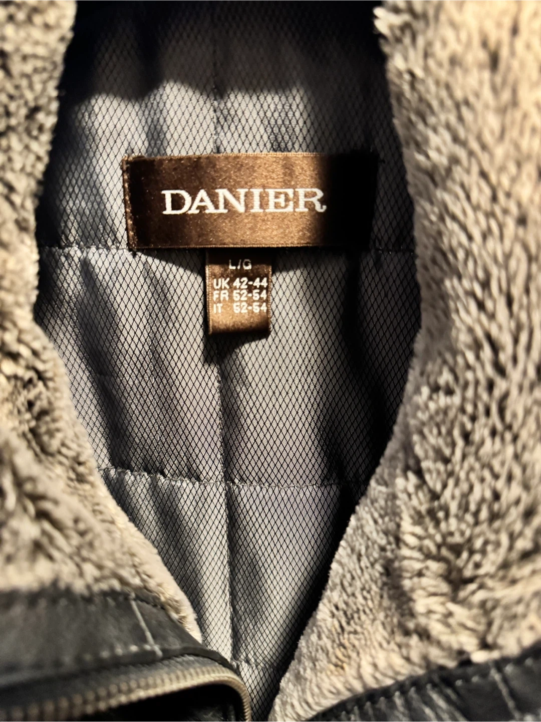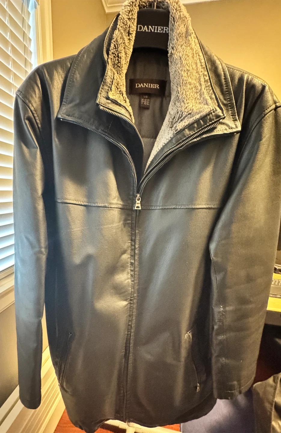 Selling a Danier leather jacket in size L/G. It's in great condition and features a cozy collar lining.