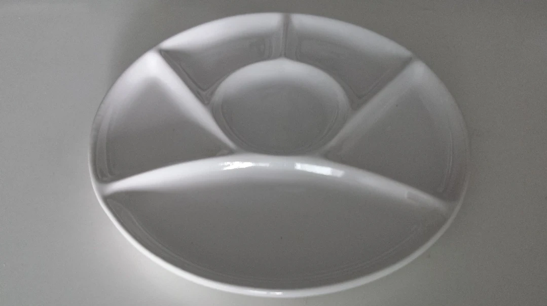 Here's a white ceramic serving plate with divided sections! It's perfect for serving snacks, appetizers, or dips at your next gathering. It's in great condition and ready to use