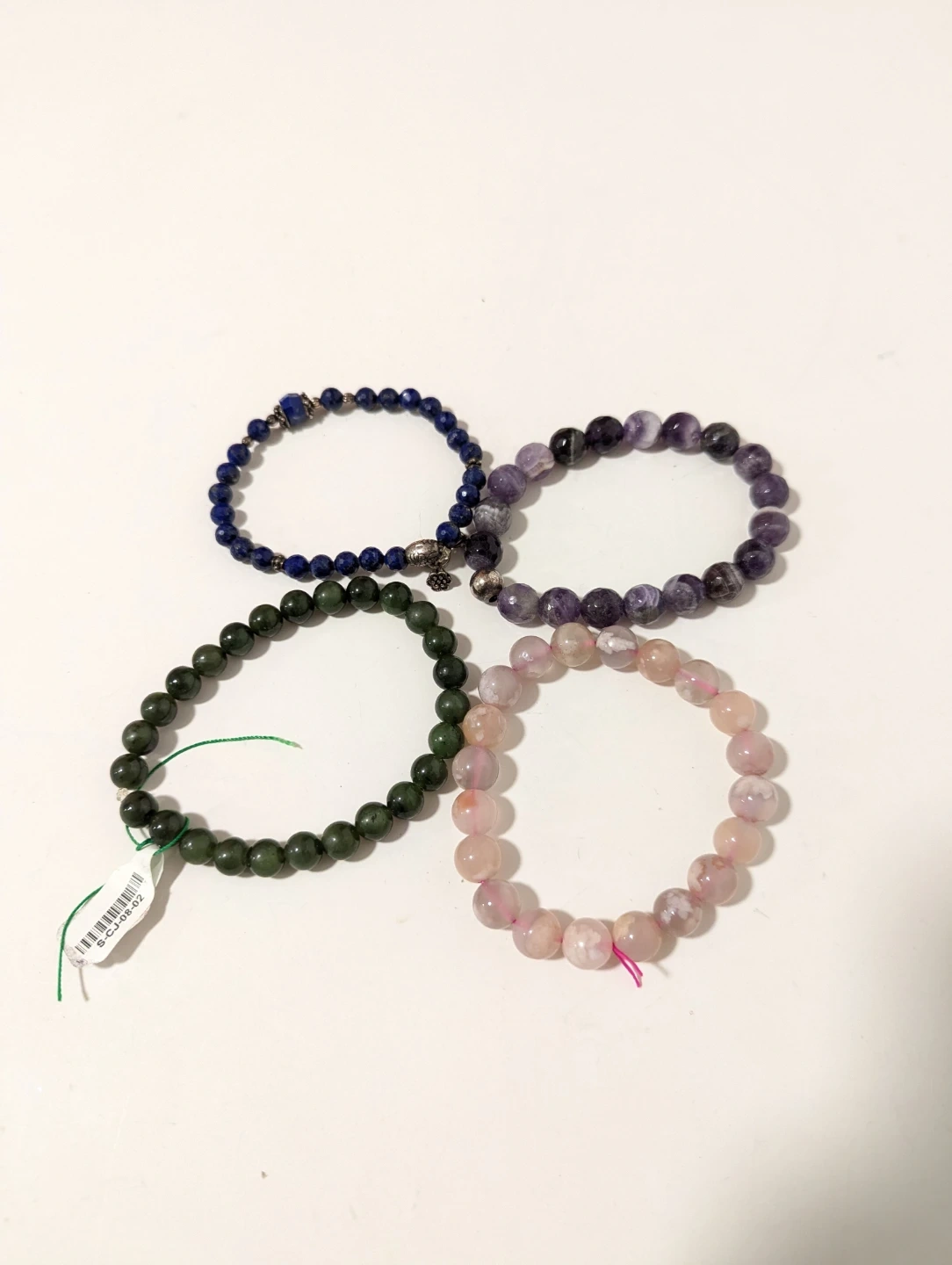Selling a set of four beaded bracelets in different stones. Canadian Jade, Lapis Lazuli, Amethyst and Rose Quartz.