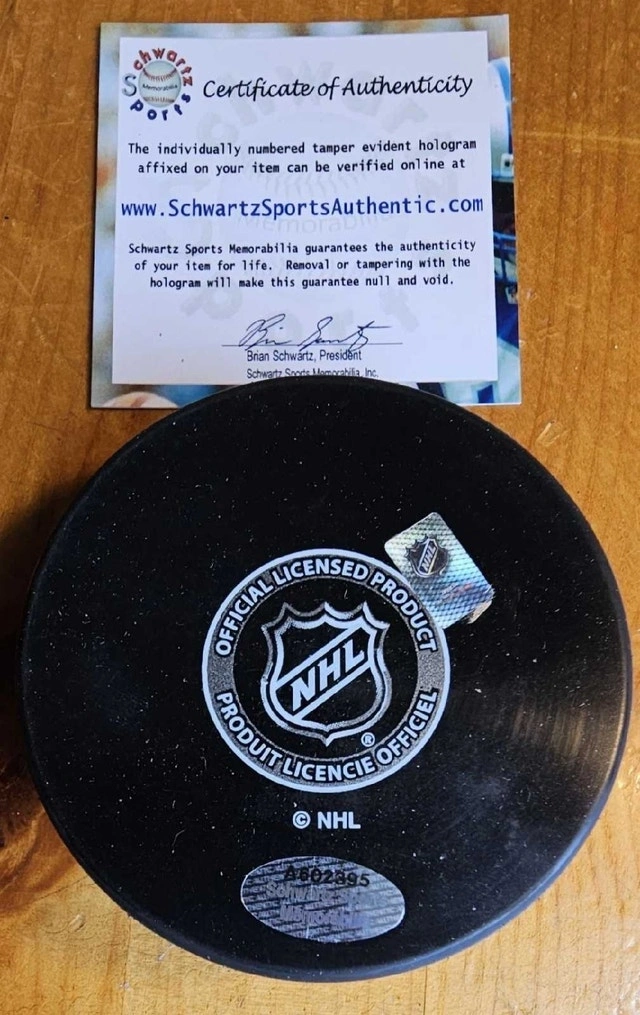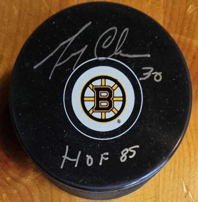 Experience a piece of hockey history with this autographed puck by the legendary Gerry Cheevers of the Boston Bruins. A must-have for any Bruins fan or hockey memorabilia collector, this puck comes with a Certificate of Authenticity, ensuring its signature's legitimacy and originality. Crafted for display or as a cherished keepsake, this puck symbolizes a celebrated moment in hockey and sportsmanship. The puck's distinct markings highlight its authenticity, making it a standout addition to any sports fan's collection.