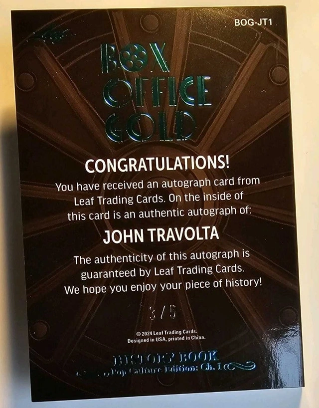 Explore the essence of pop culture with the 2024 Leaf Pop Culture History Book "Box Office Gold", featuring John Travolta. This exclusive collectible, numbered BOG-JT1, is one of only five in existence, making it a rare treasure for enthusiasts and collectors alike. Autographed by Travolta himself, this non-sport trading card is a testament to his enduring impact on the entertainment industry. It's a must-have for any fan looking to own a piece of cinematic history. Add this gem to your collection and celebrate the legacy of a true pop icon.
