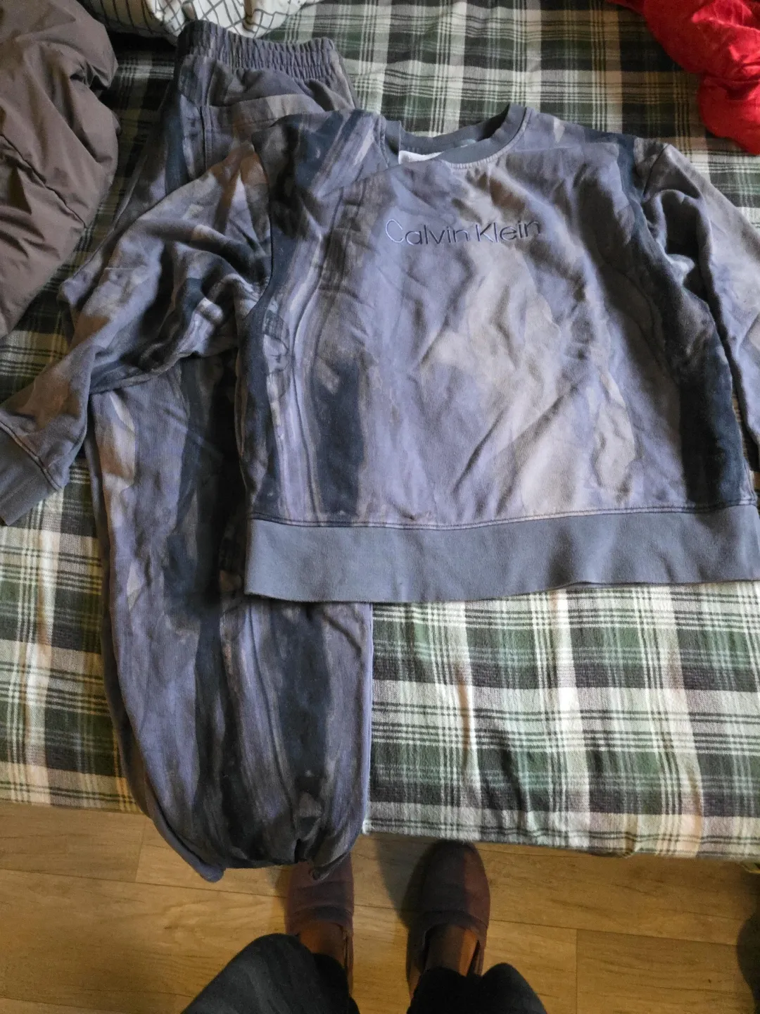 Selling a Calvin Klein sweat suit. It's a matching set with a cool marble pattern in shades of grey and blue. Perfect for lounging around or running errands