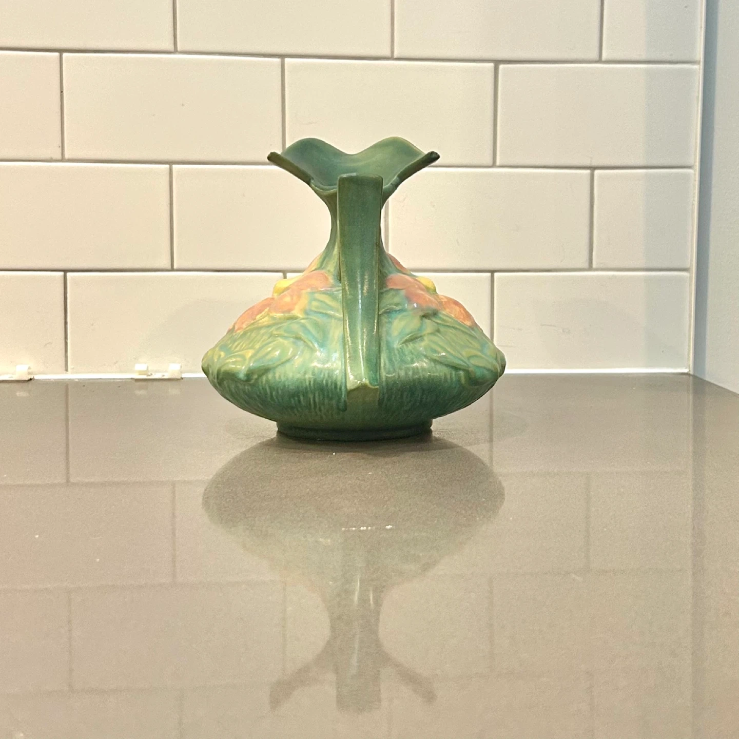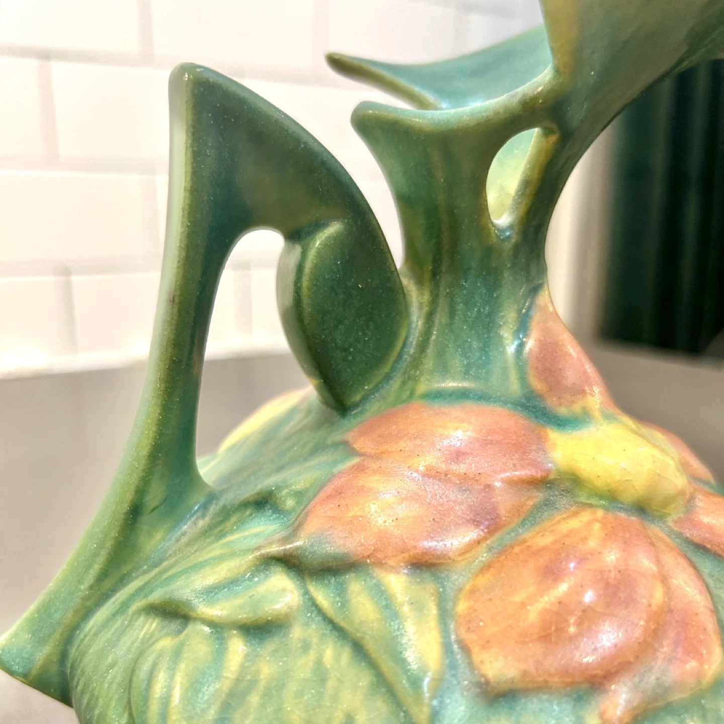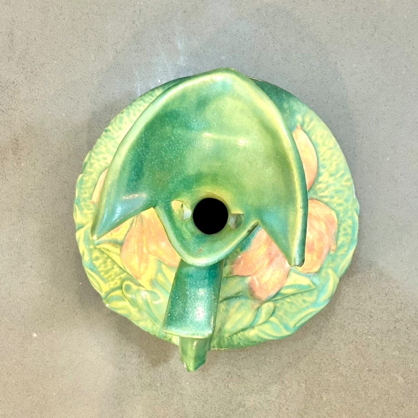 This sculptural ewer form features molded water lily blossoms and leaves with pierced handle and flared rim. Finished in Roseville’s classic green matte glaze with natural kiln variation.