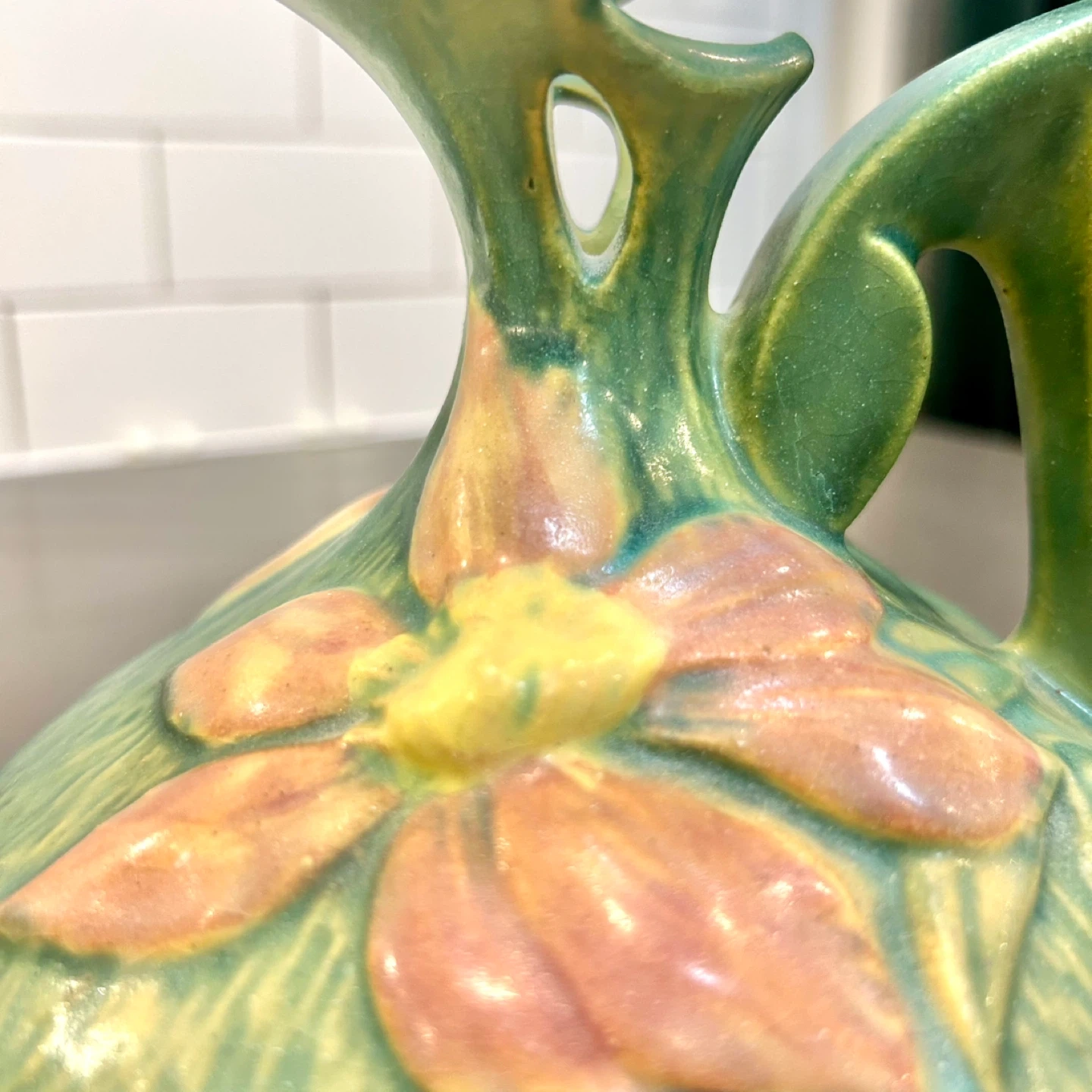 Very good vintage condition. No cracks, no repairs. Minor base wear consistent with age. Glaze pooling and color variation are original to manufacture.