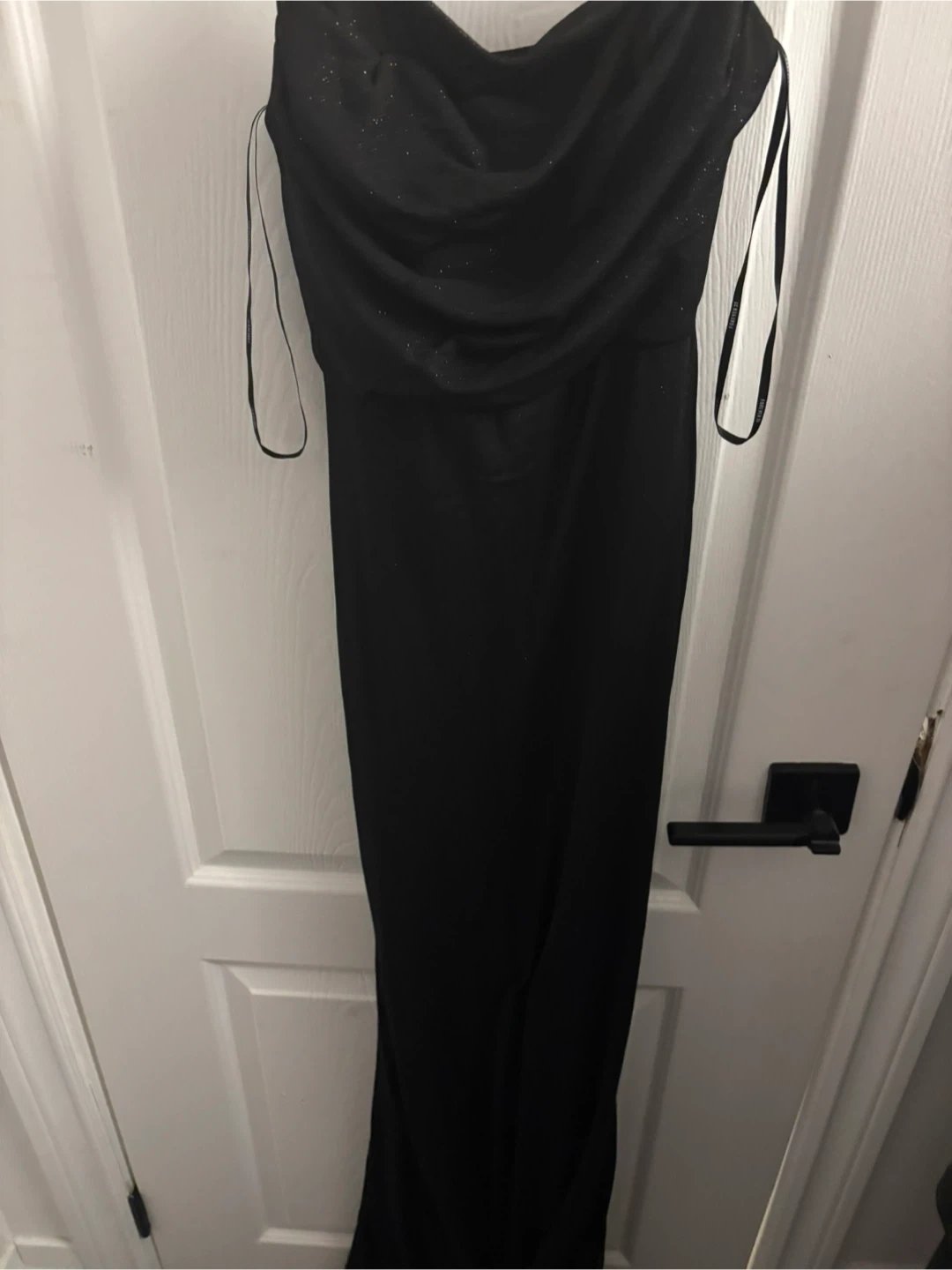 Selling a beautiful black evening dress. It's in great condition and ready for a night out! The dress has a lovely drape and elegant design.