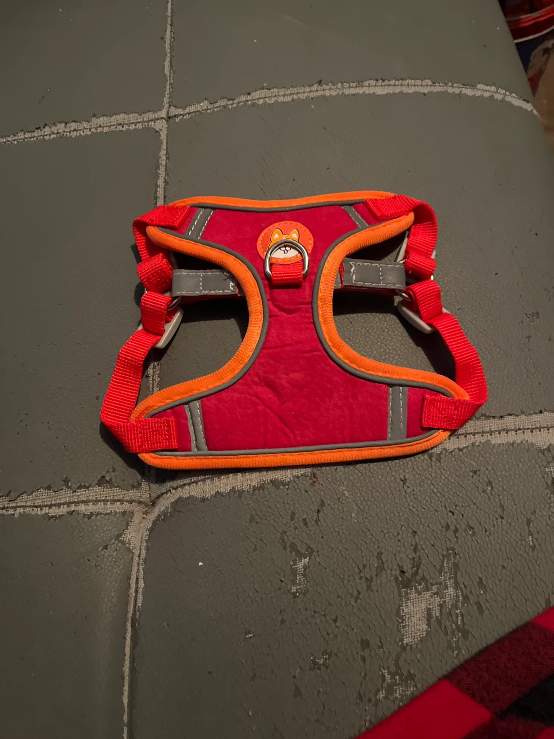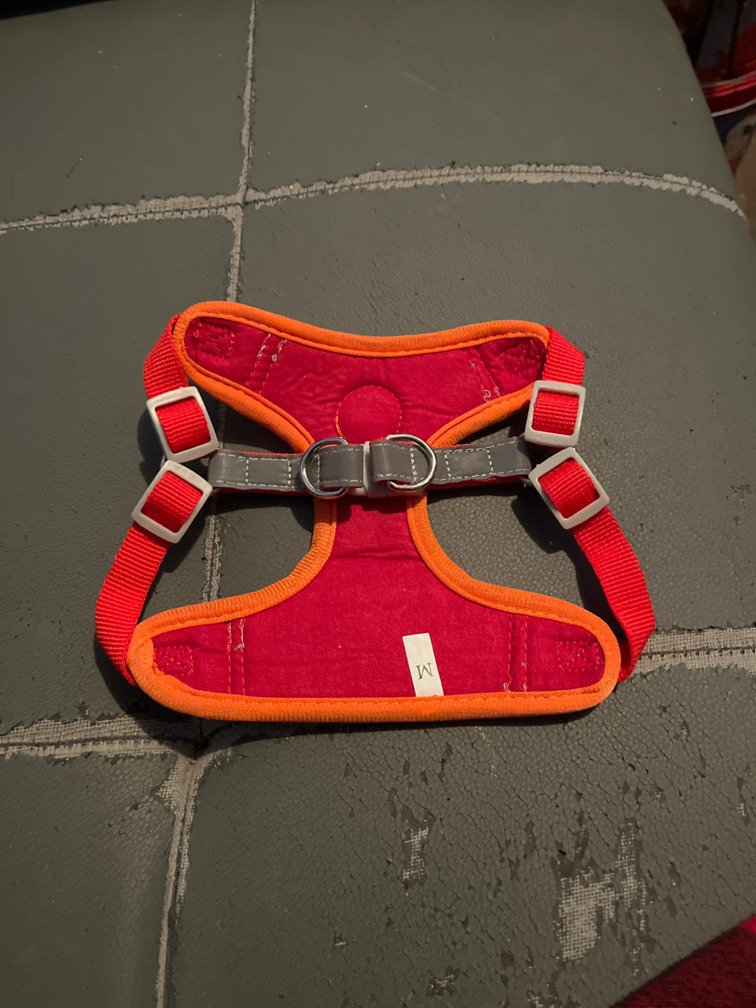 I'm selling a Top Paw dog harness in size medium! It's red with orange trim and reflective accents. This harness is perfect for walks and outdoor adventures with your furry friend it doesn’t even look like a medium. It looks like for a tiny dog or a cat.