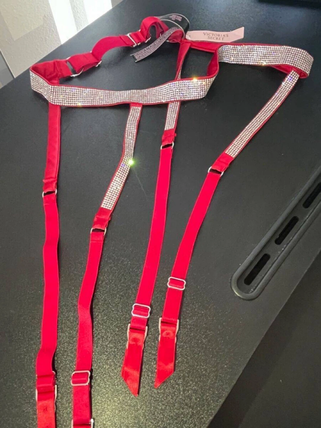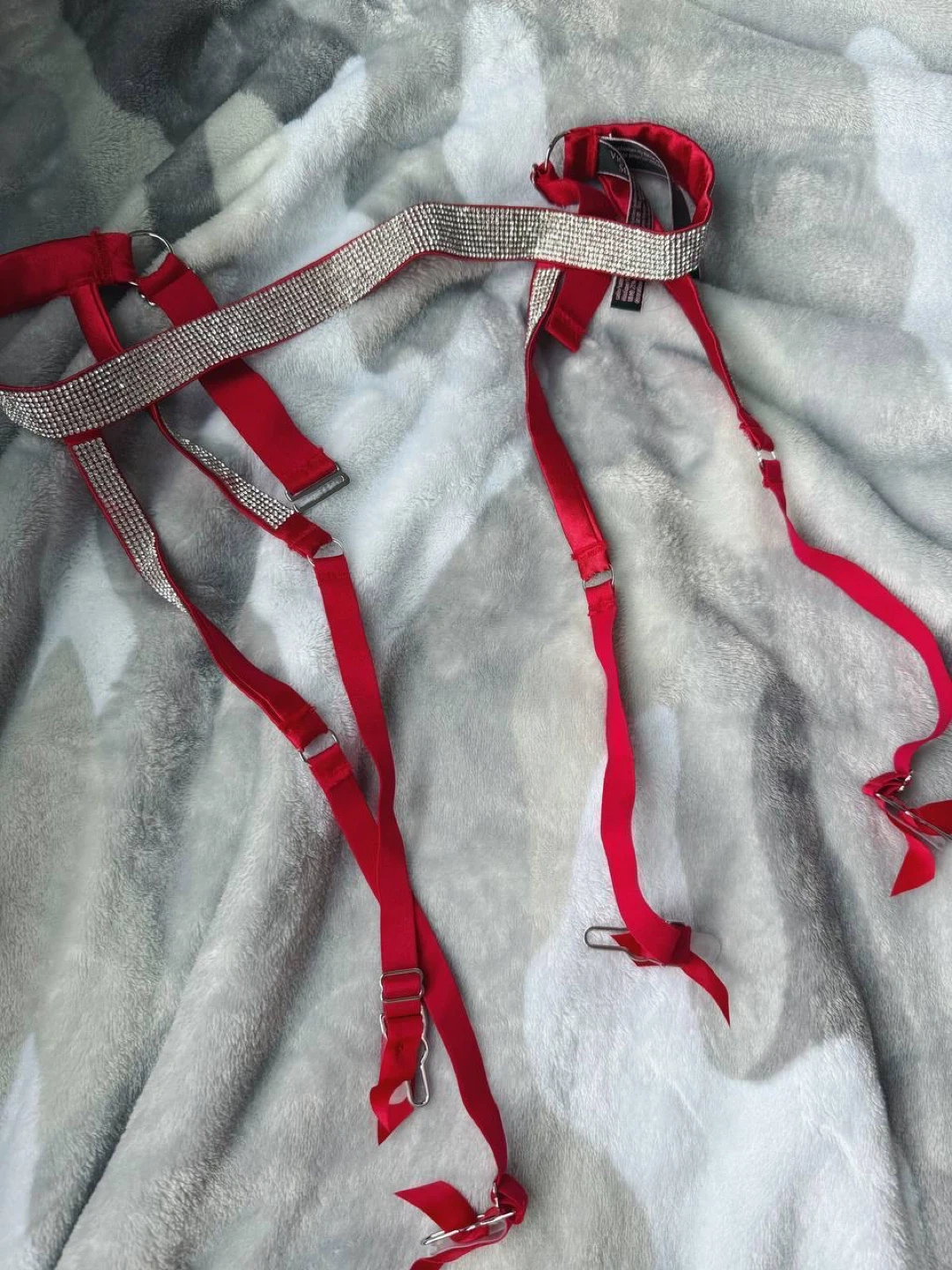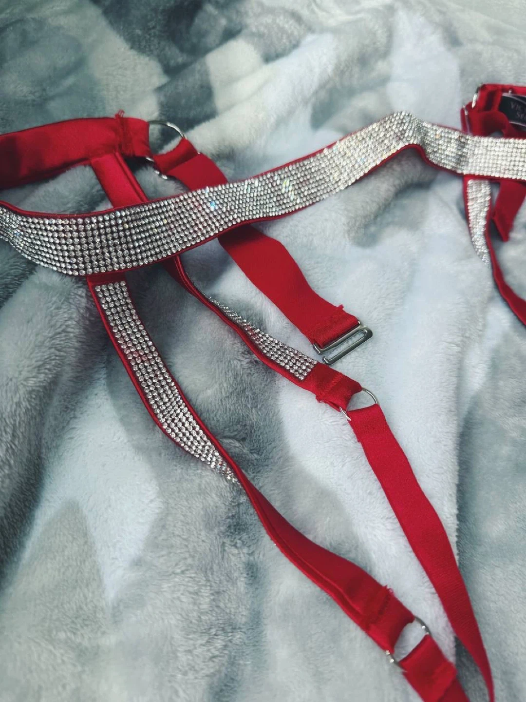 Red satin garter belt. Features a rhinestone-encrusted band and adjustable straps. Excellent for special occasions.