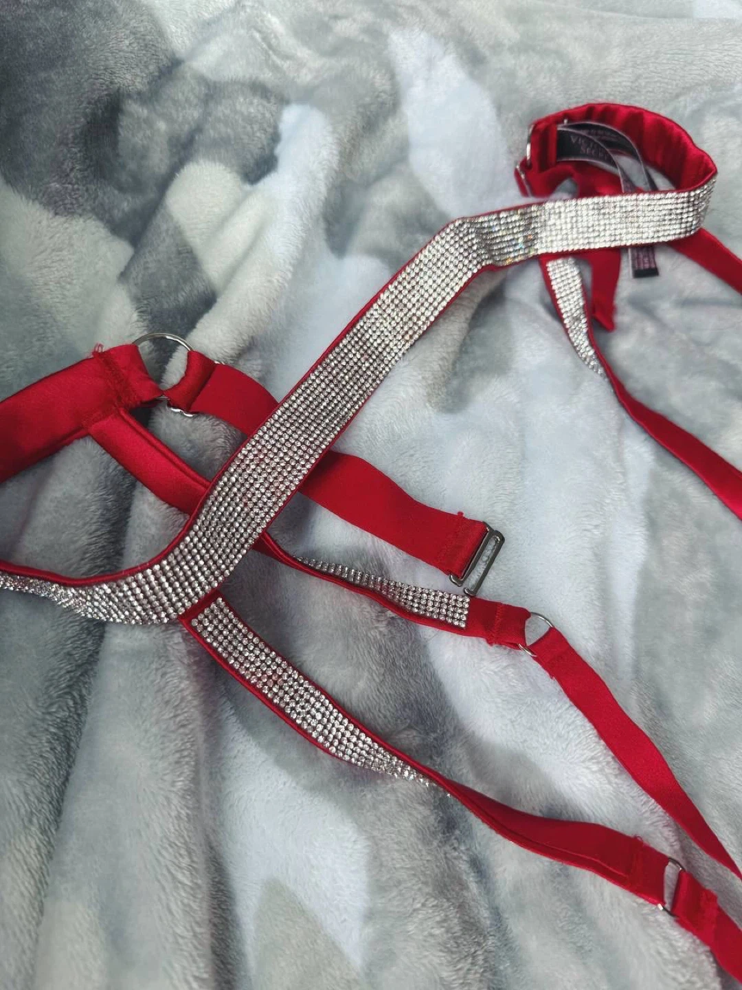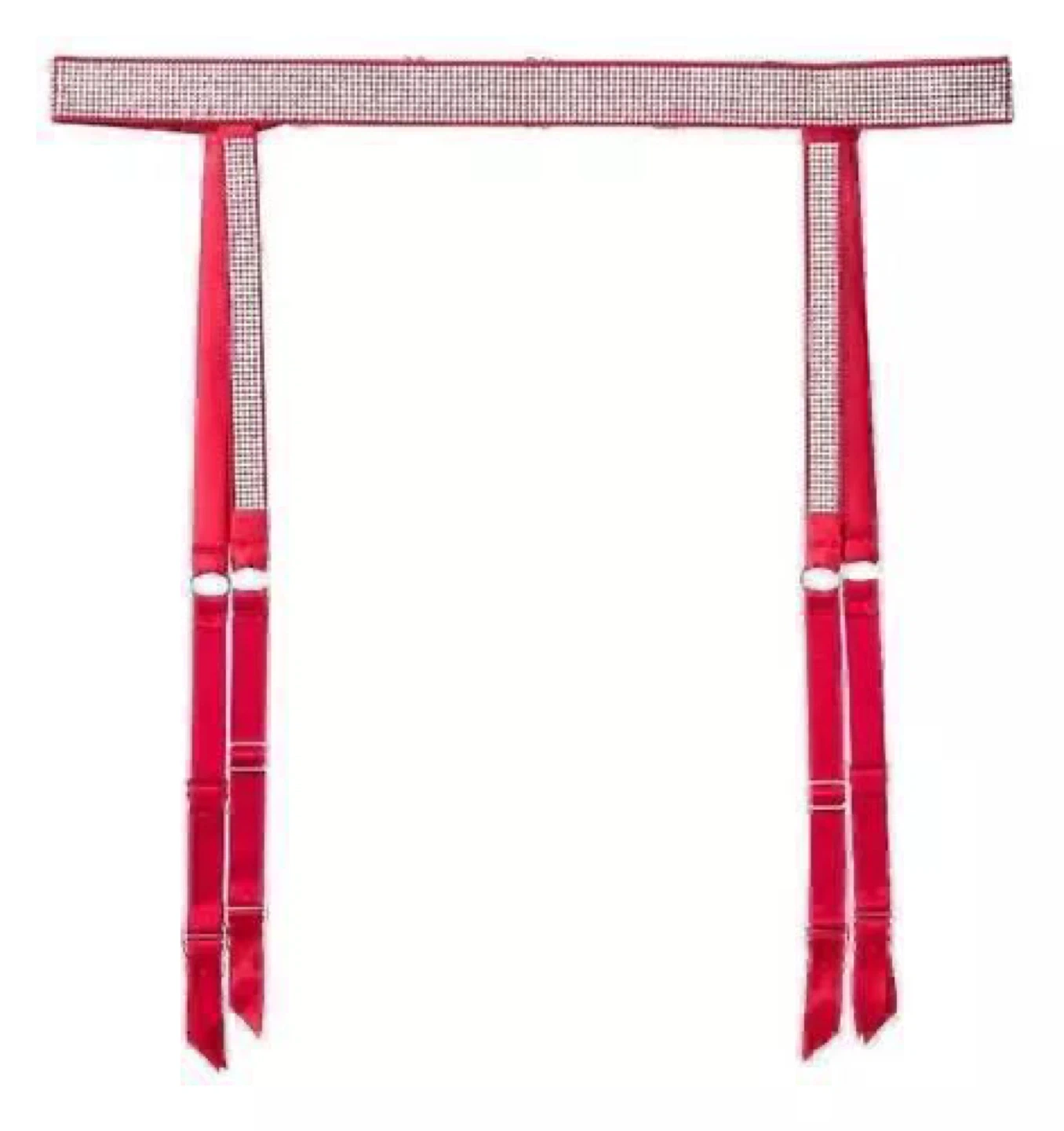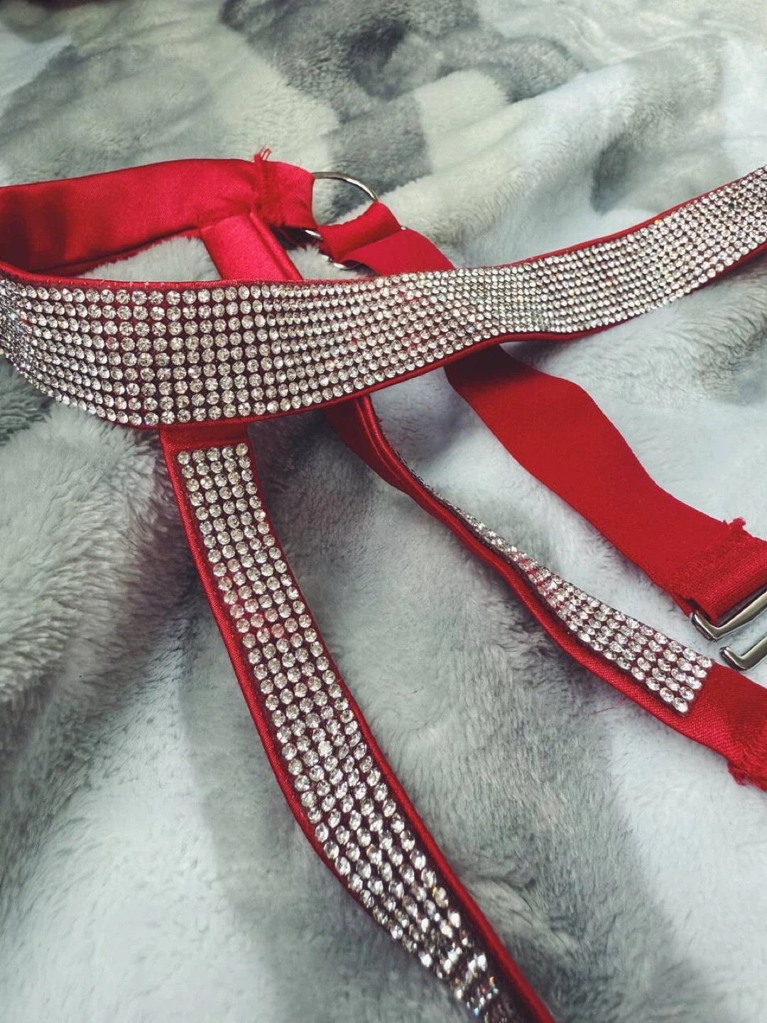 Red satin garter belt. Features a rhinestone-encrusted band and adjustable straps. Excellent for special occasions.