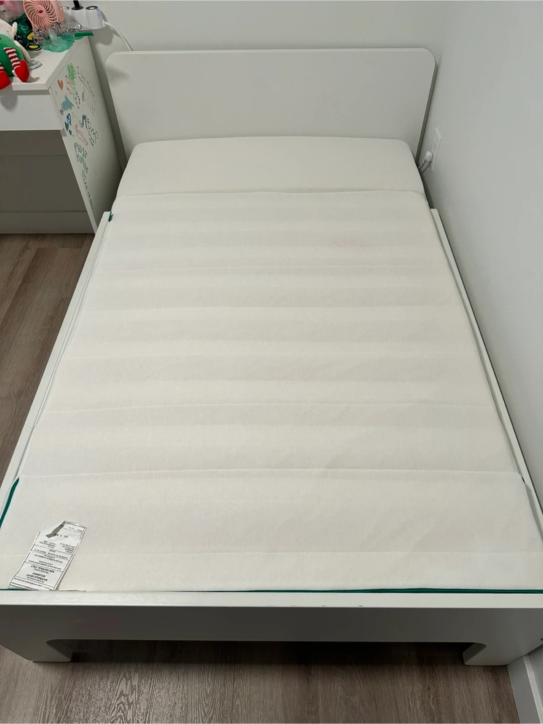 Selling an IKEA Sundvik extendable bed frame with a mattress. It's in great condition and perfect for a growing child! The bed is white and can be adjusted to different lengths as needed