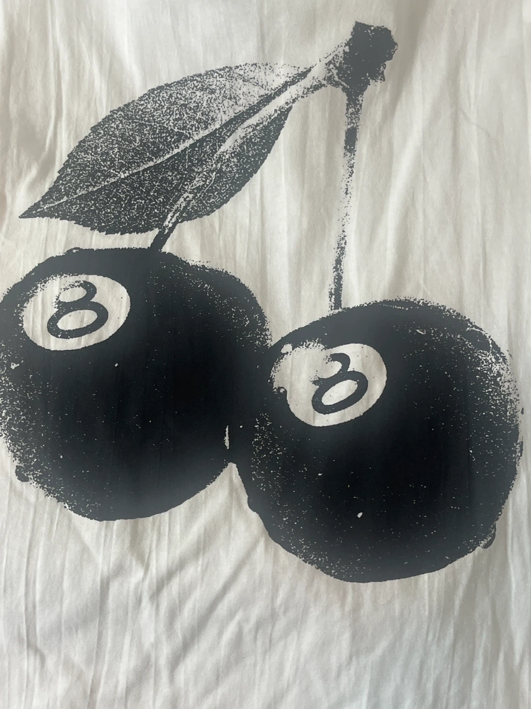 Selling a Stussy T-shirt with a cool 8 ball cherry design on the back! It's a size small and in great condition. The shirt is white with a black graphic. Perfect for adding a bit of streetwear style to your wardrobe