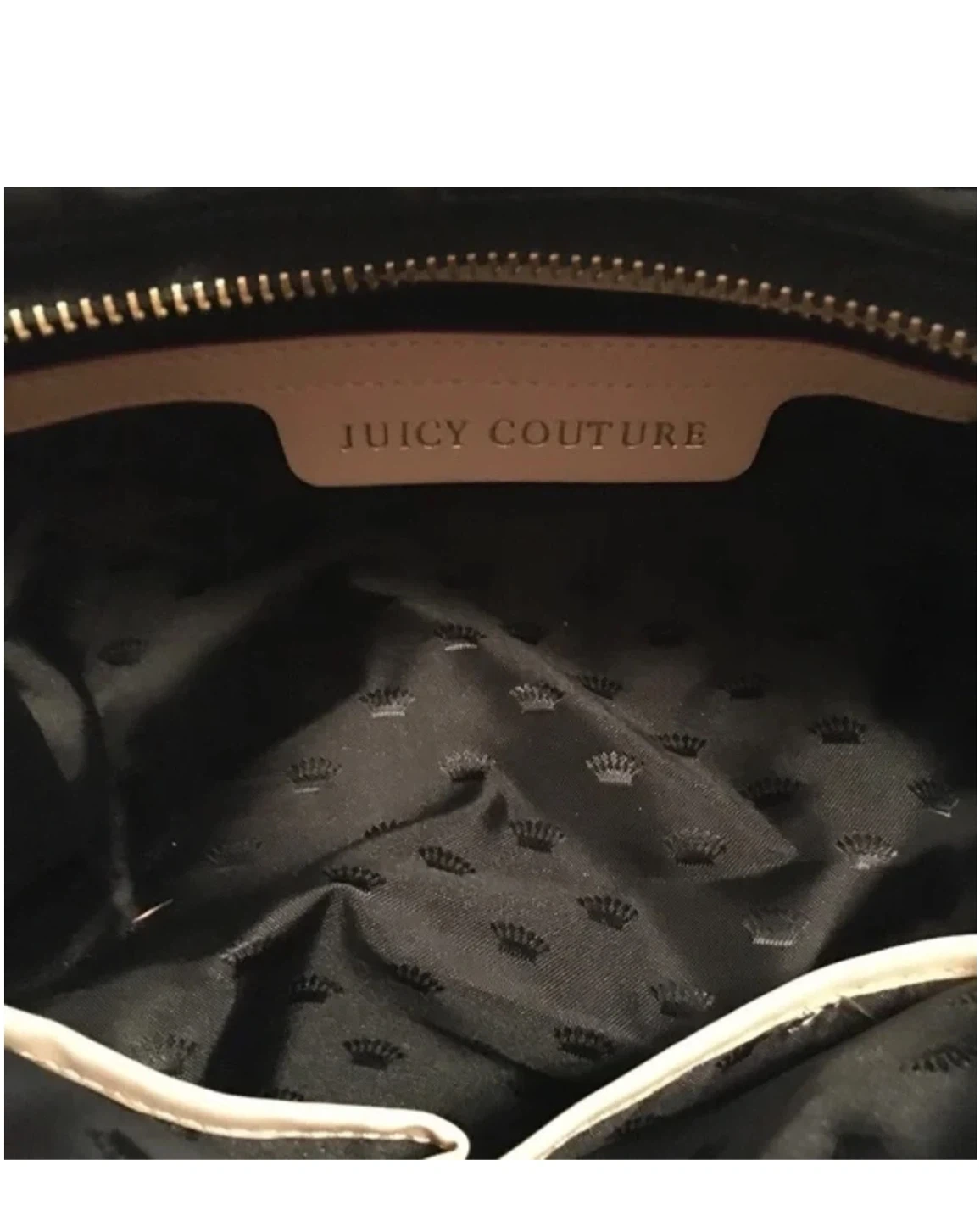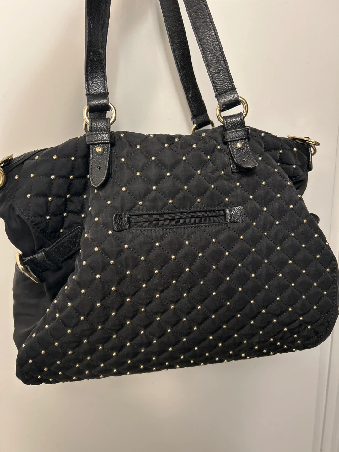 Selling a Juicy Couture tote bag in black. It has a quilted design with gold studs. The handles show some wear, but it's still a stylish bag!