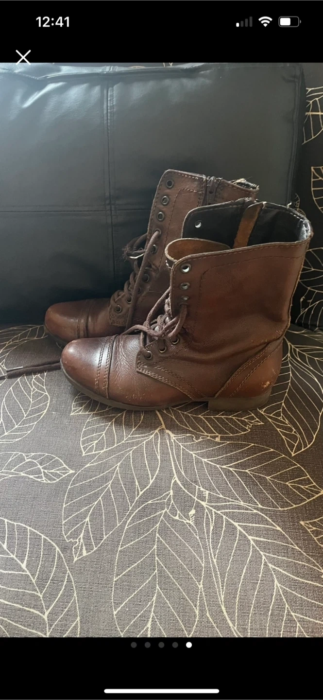 Selling a pair of Steve Madden Troopa combat boots in size 5.5. They have a leather upper and synthetic lining with a rubber outsole. These stylish boots are perfect for adding a bit of edge to any outfit!