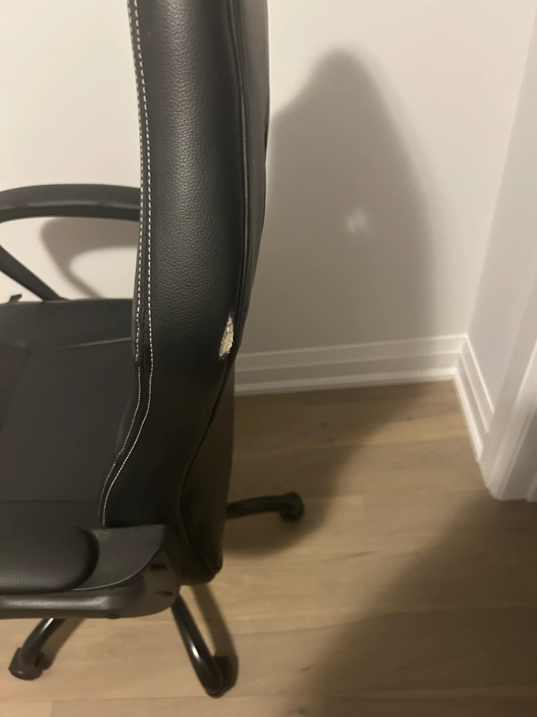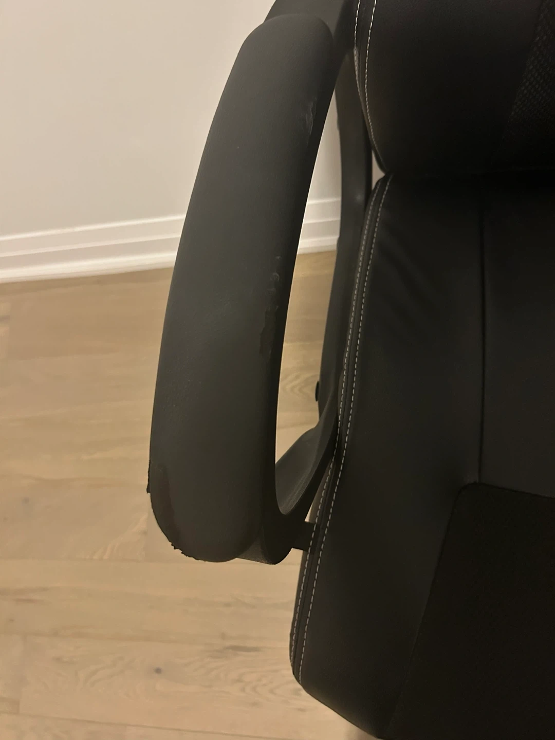 Selling a black gaming chair. There are some signs of wear and tear on the arm rests and the back of the chair, as shown in the pictures. It's still a comfy chair to use!