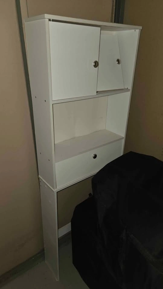 Hello, this shelving storage unit has served me nice! There's covered (with a flip door) compartment underneath the bottom shelve. So, it's basically 2 compartments with doors and 1 shelve that's in between :) It can store quiet a lot of things like deodorant, tooth paste, hair brush and etc. It has minimal water damage, maybe just a scratch here and there, otherwise, everything works perfect. The back anti-fall system is not as secure as would like to but I've never had a problem with it leaning or trying to fall over. It's easy to put together or take apart. It's not heavy either :)