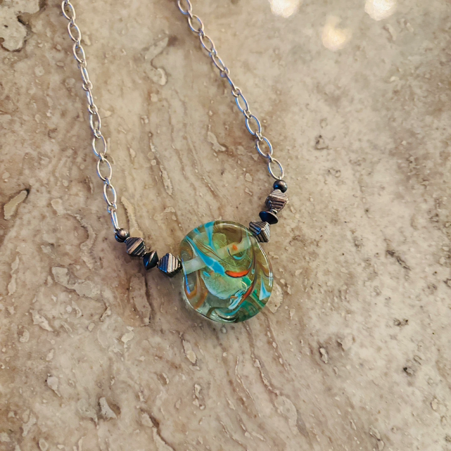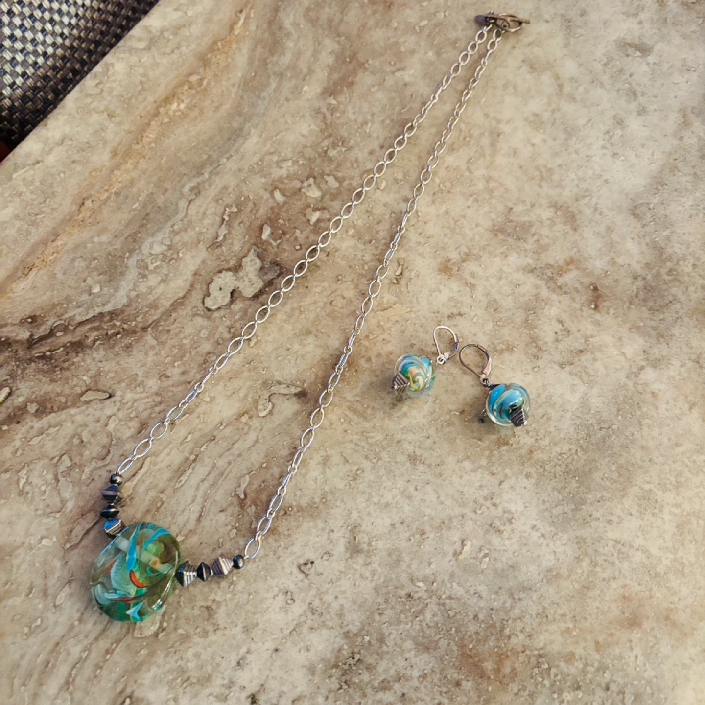 This is a beautiful handmade necklace and earring set! The necklace features a unique glass bead pendant with a colourful swirl design, complemented by silver beads. Matching earrings are included, making it a perfect set to accessorize any outfit.