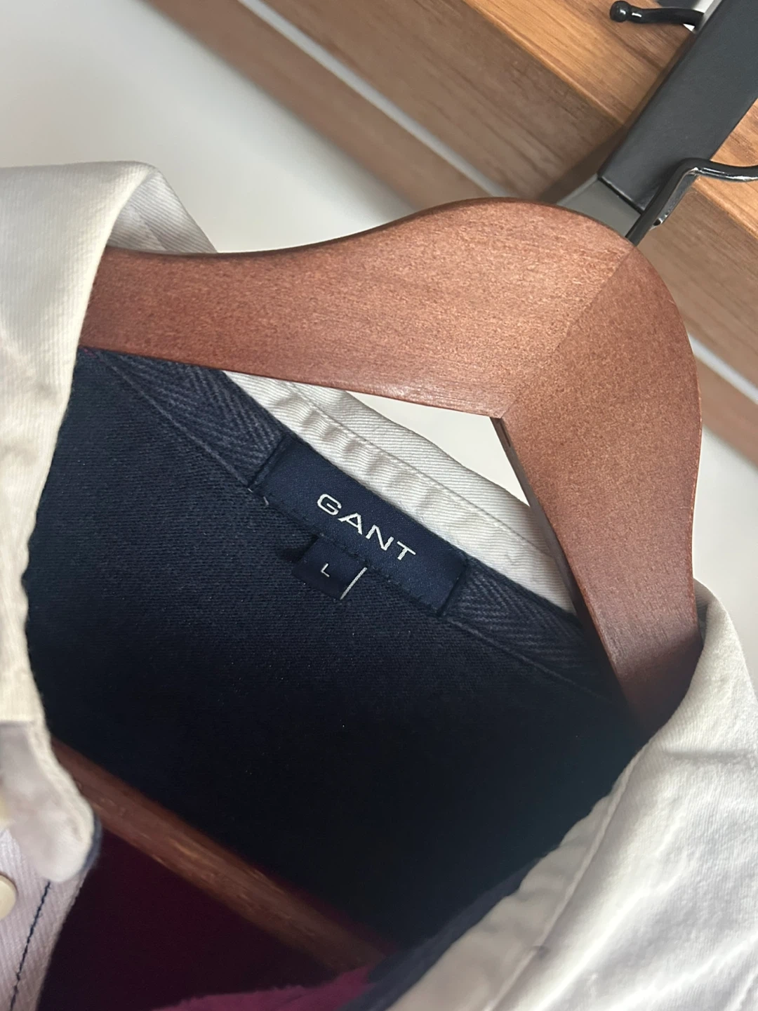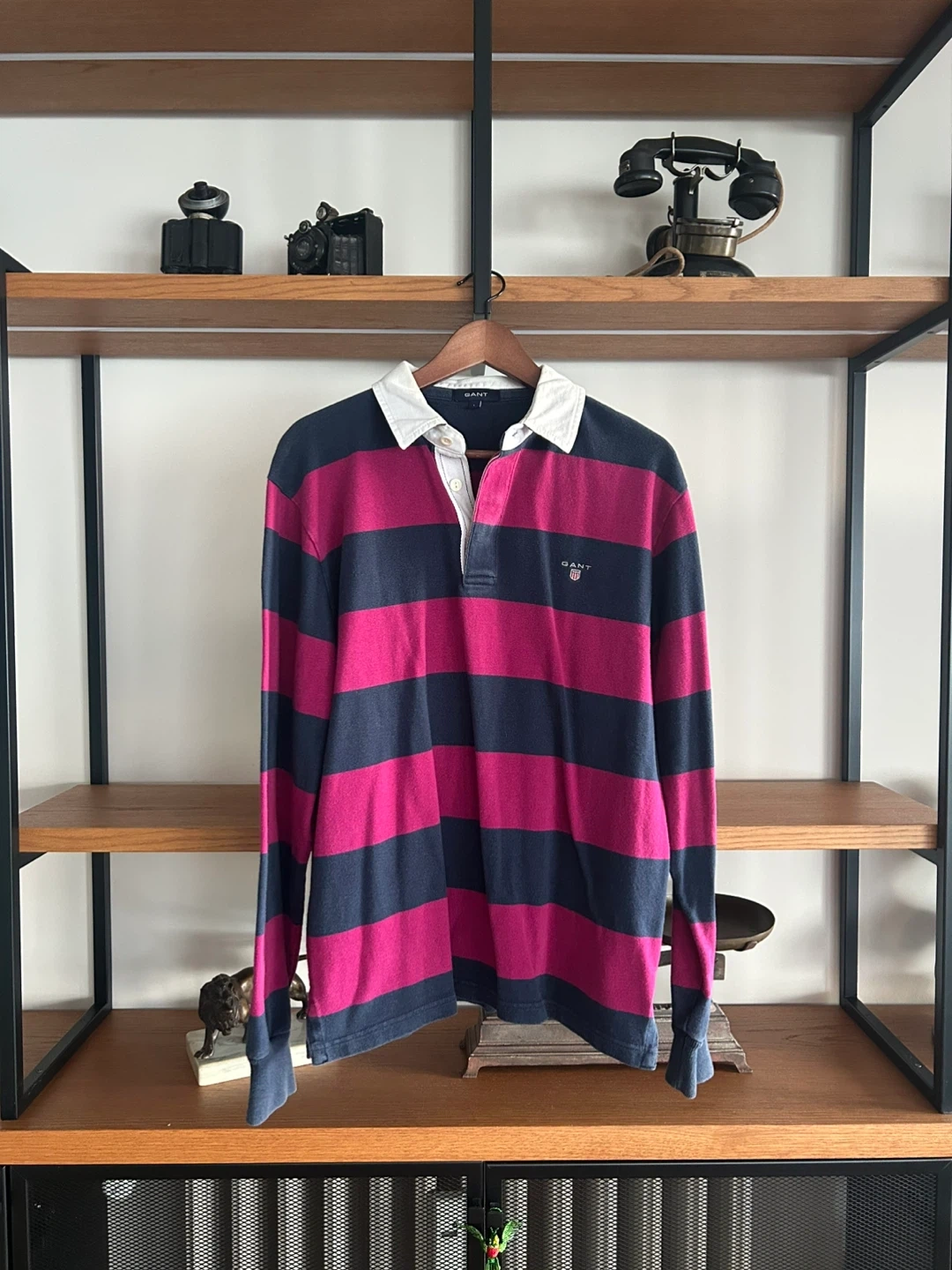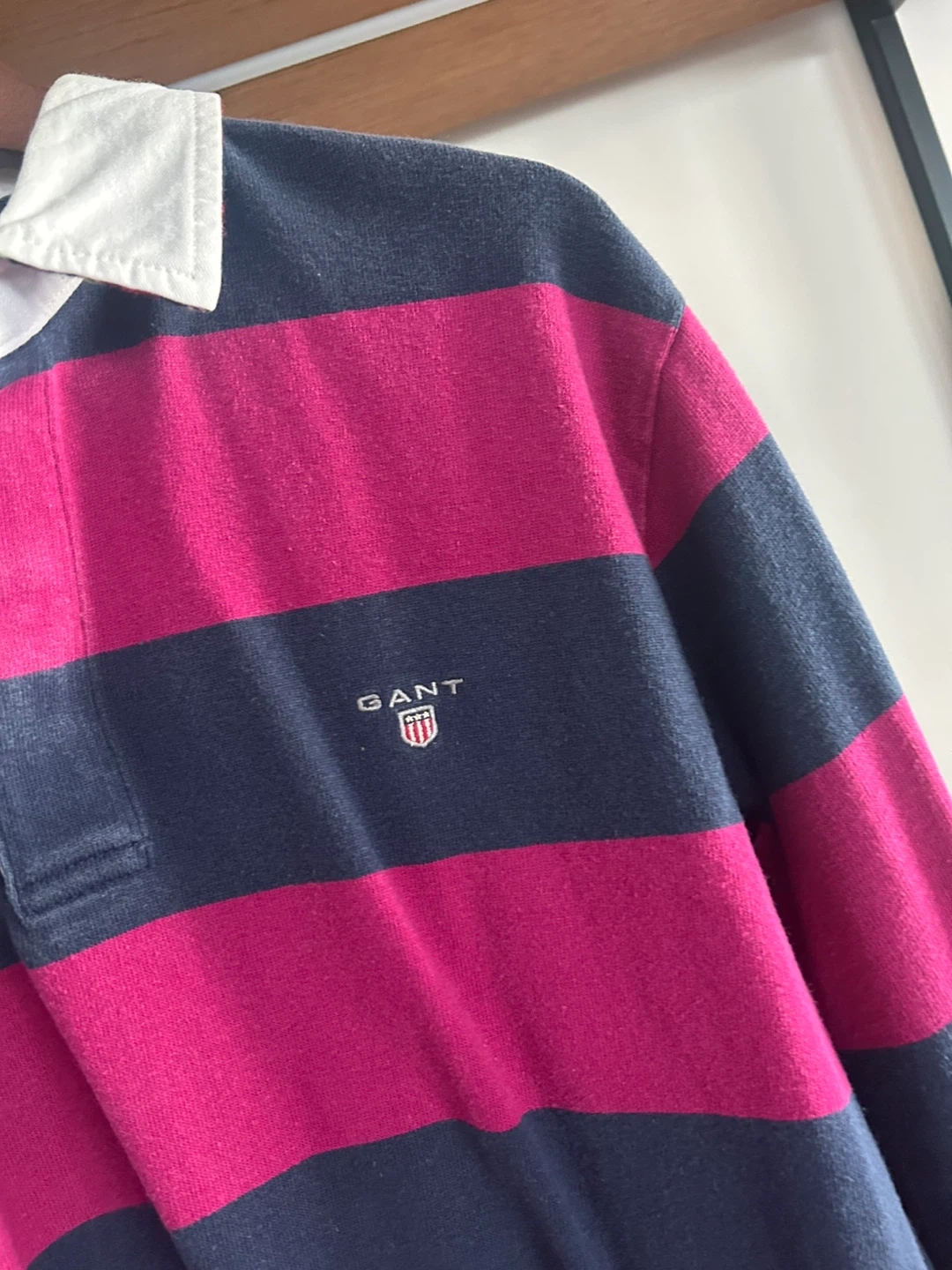 Here's a GANT rugby shirt in size L! It features a striped pattern in navy and fuchsia. Perfect for a casual, sporty look! Its never worn since i never really reached for it.