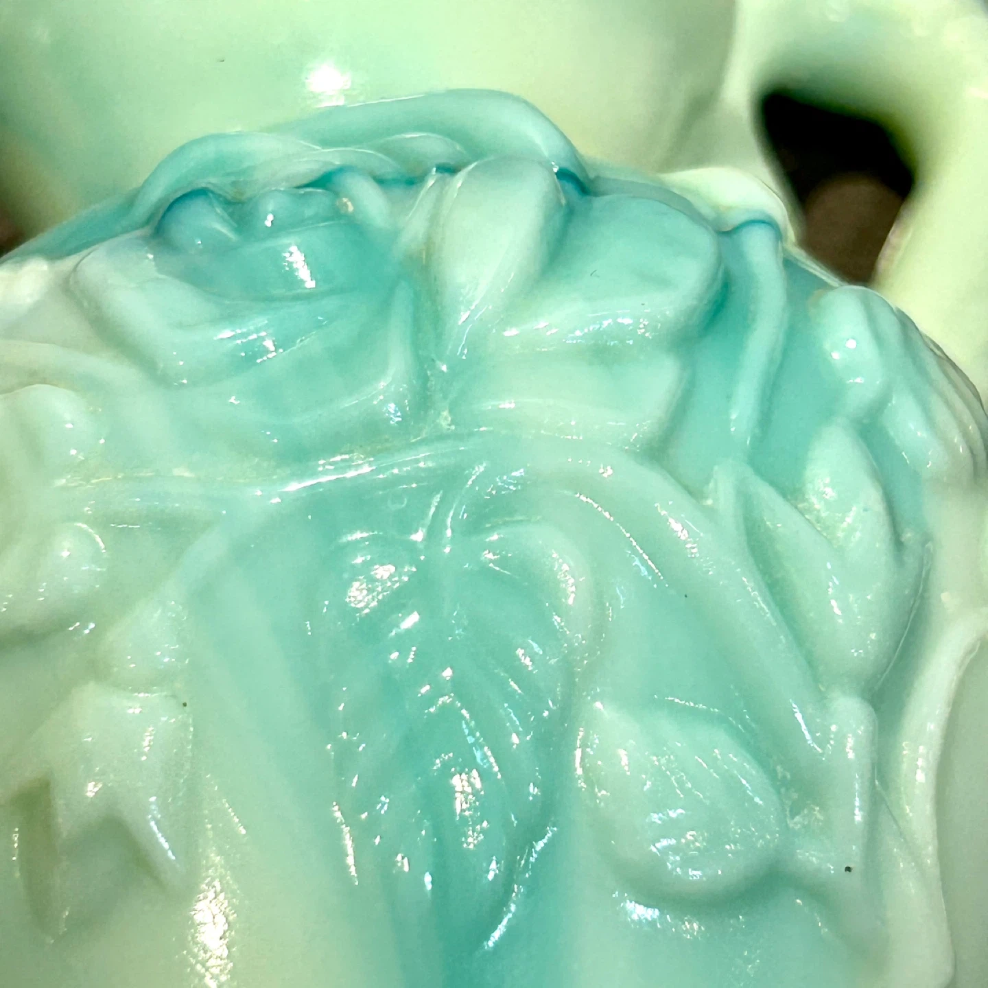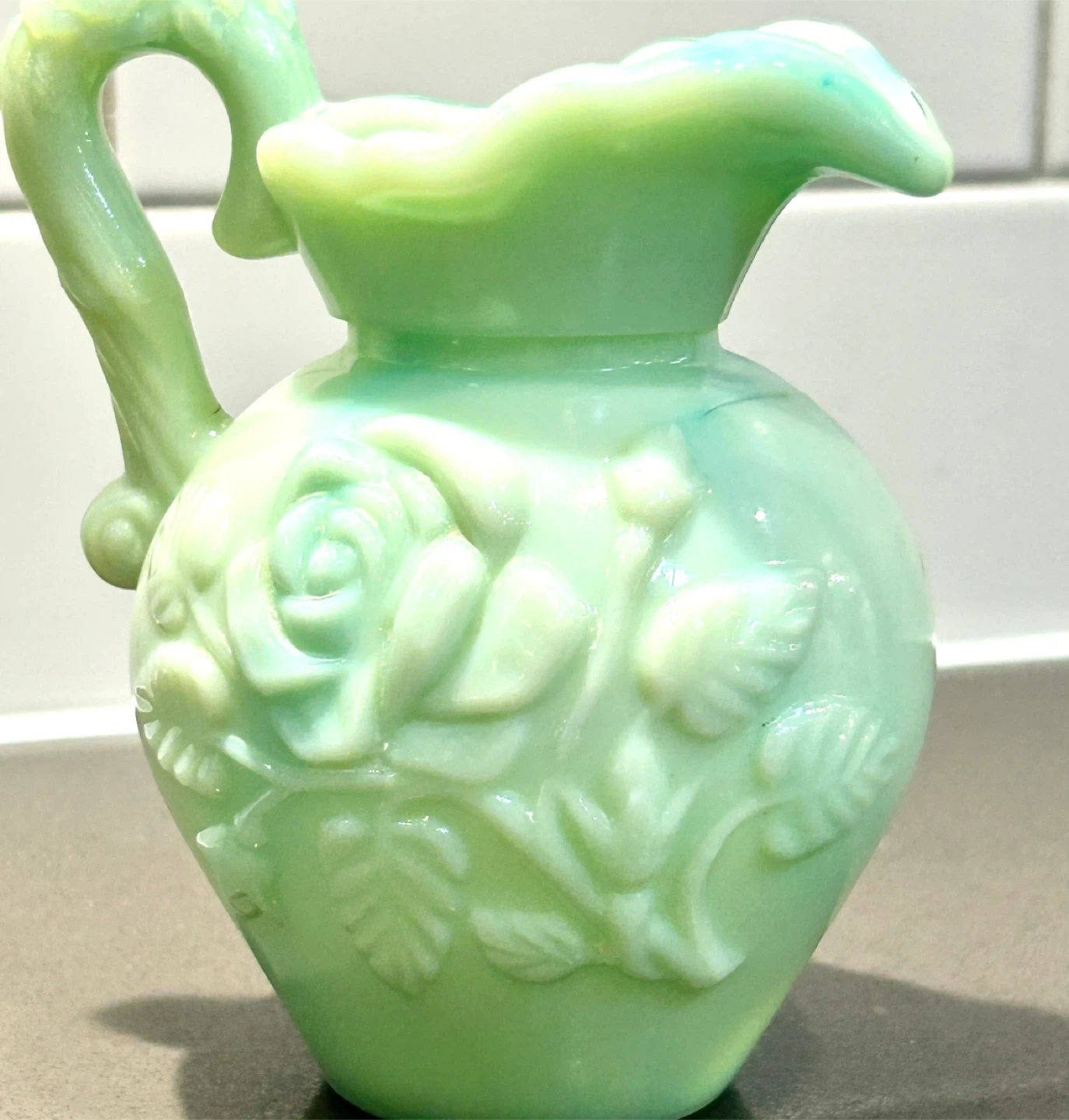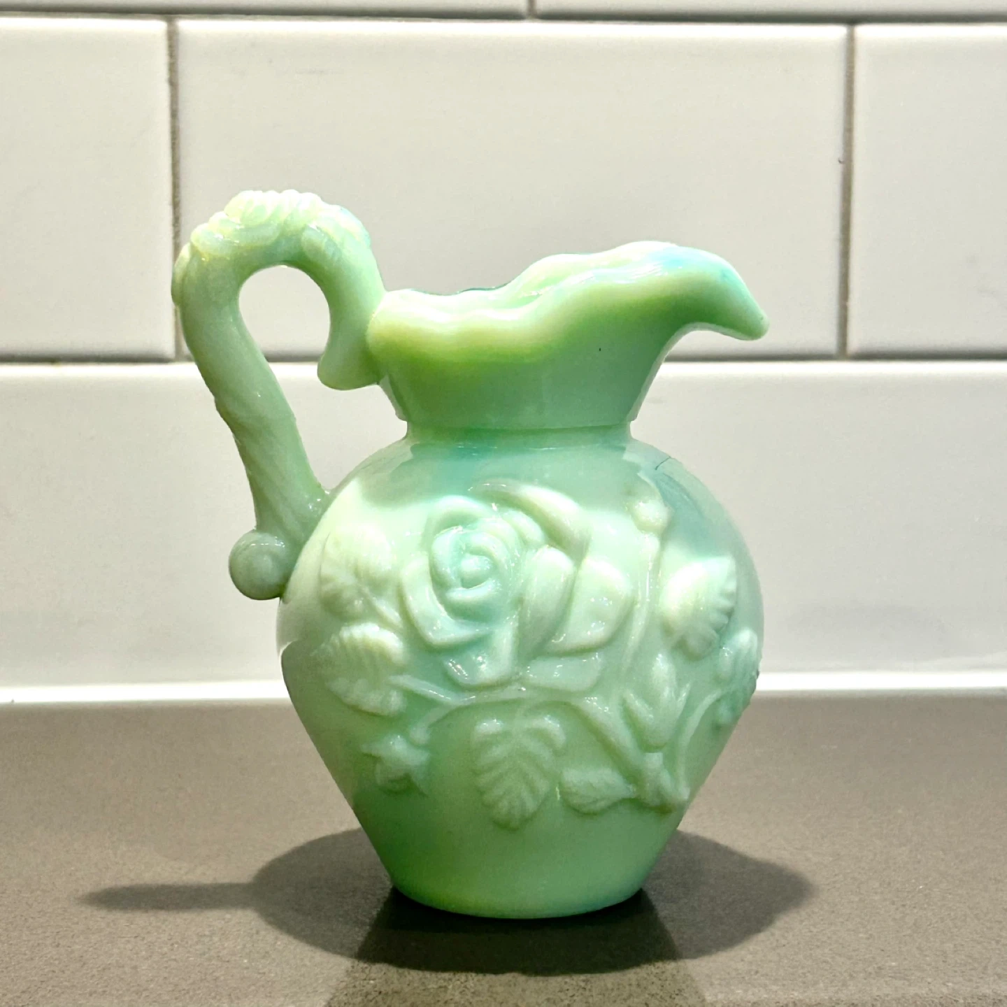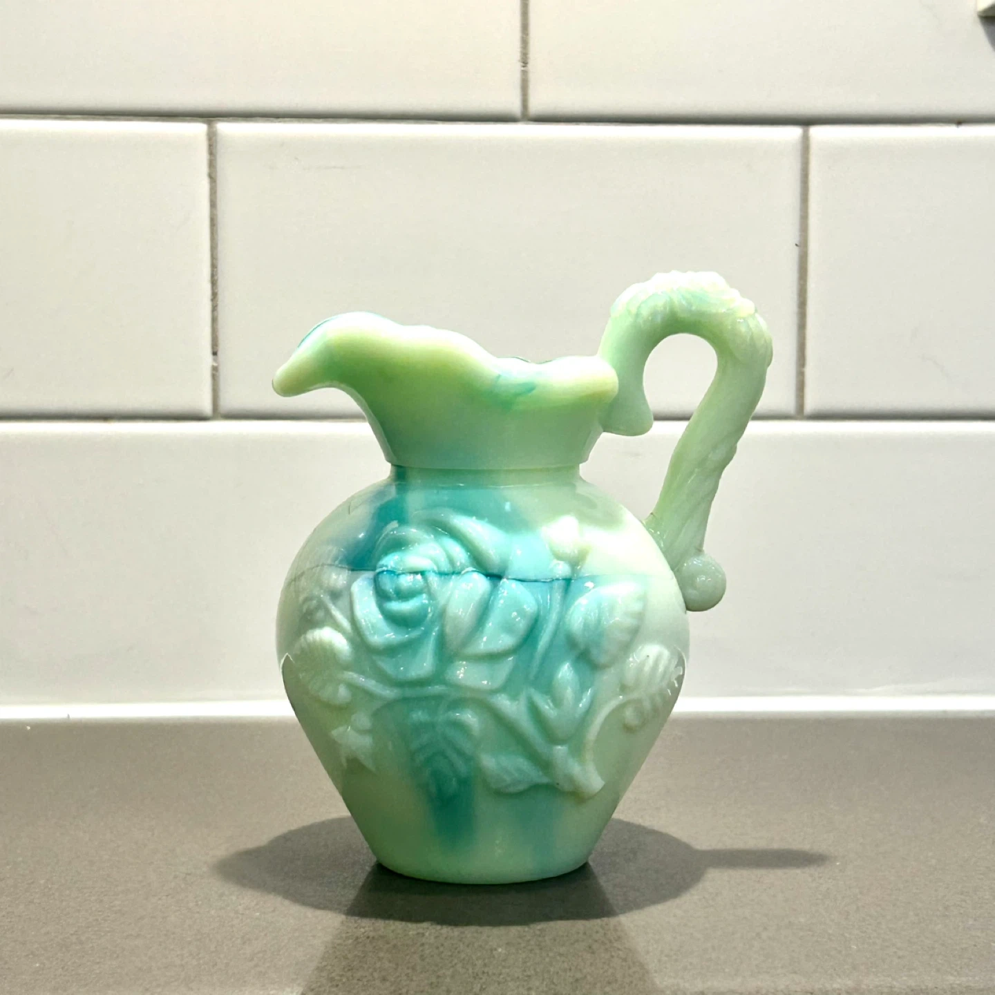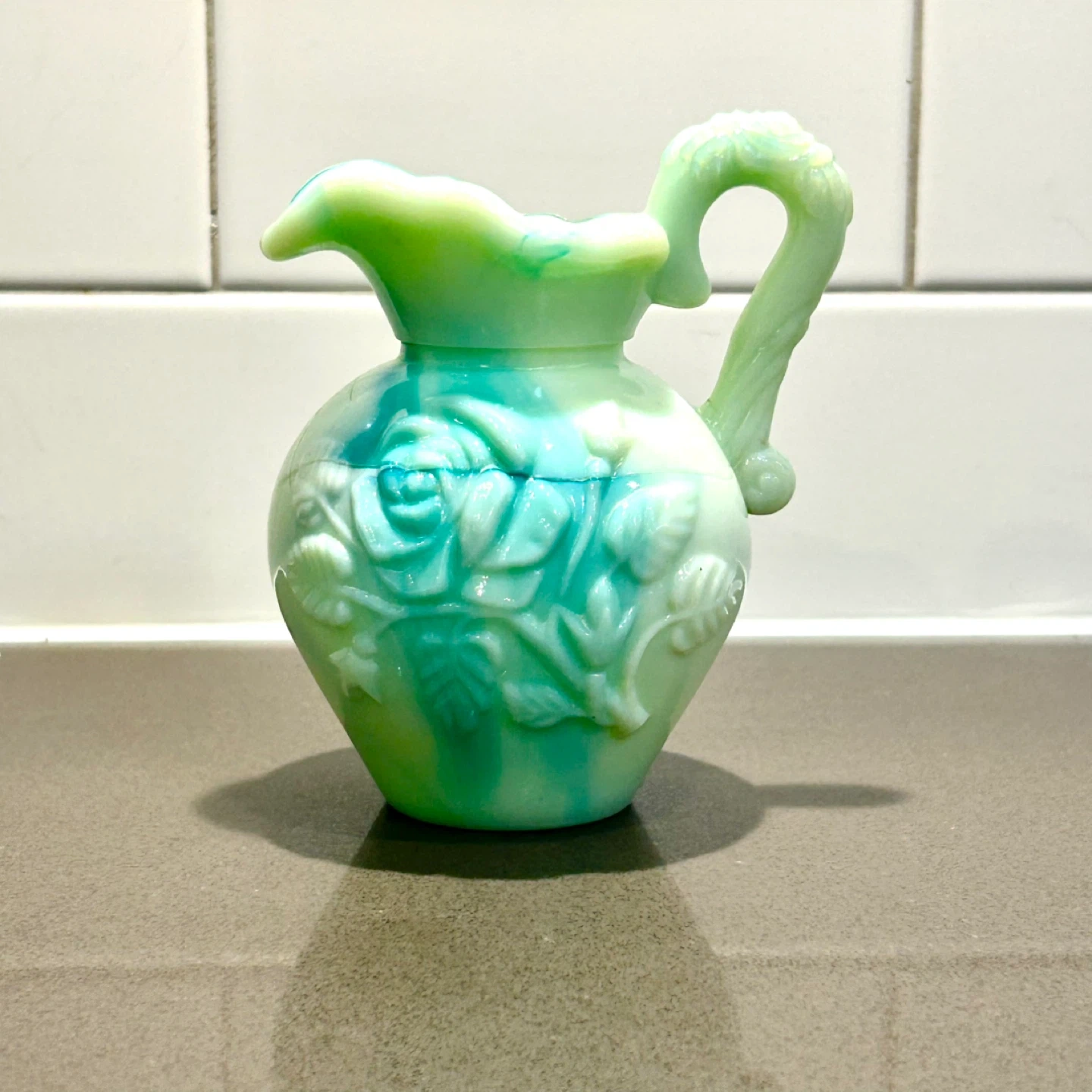 Authentic vintage Avon milk glass creamer pitcher in a rare green slag finish. This collectible piece features raised floral detailing, a sculpted handle, and Avon’s signature glossy milk glass with swirling green and aqua tones. Originally produced as a decorative Avon release, these pieces were not mass-retained and are now increasingly sought after by collectors.