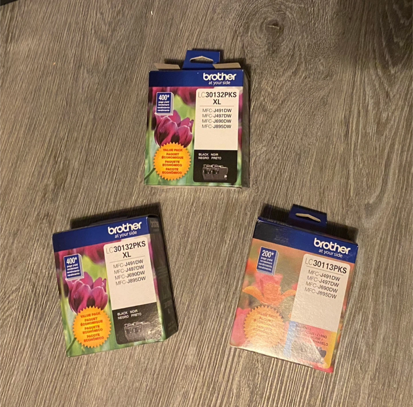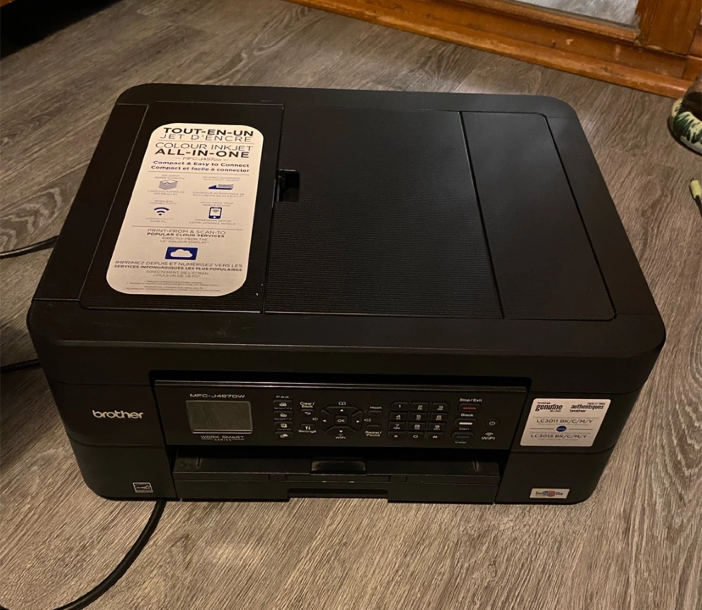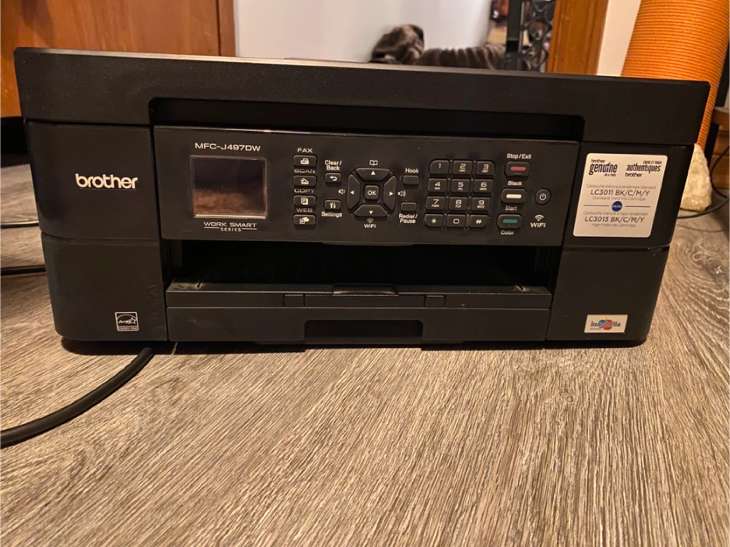 Excellent used condition, fully functioning Brother MFC-J497DW wireless colour printer, including 3 black toner replacement cartridges, 1 magenta, 1 cyan and 1 yellow replacement cartridge (and the BMCY cartridges currently installed in the printer). Comes with the box.