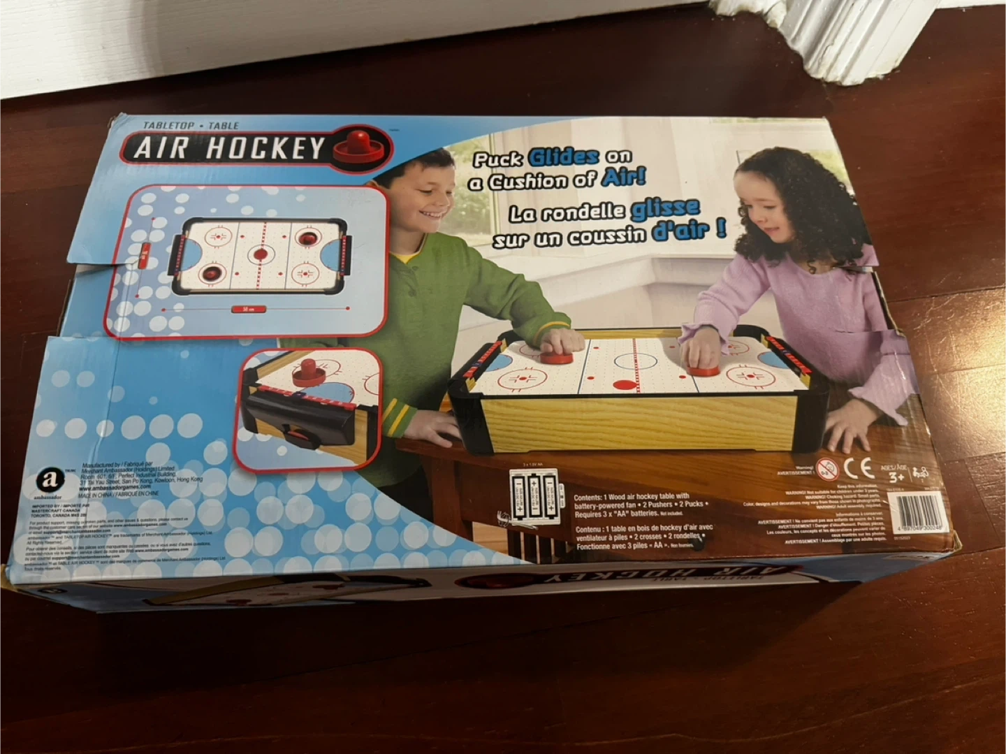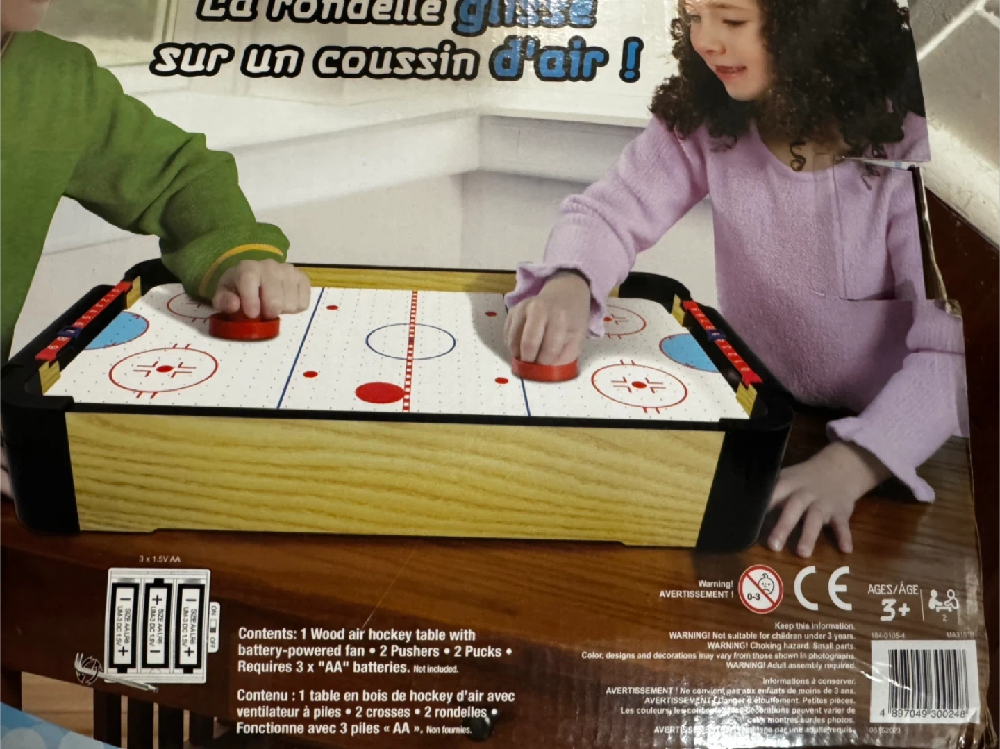 * Includes: 1 Wood air hockey table with battery-powered fan, 2 Pushers & 2 Pucks, Requires 3 x "AA" batteries (not included)