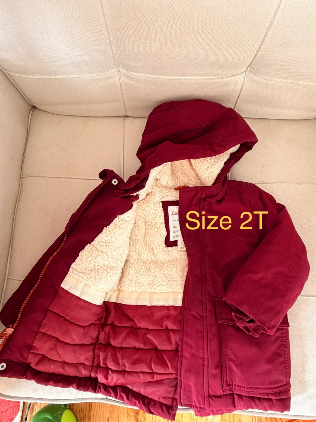 This is a Cat & Jack winter coat for toddlers, size 2T. It's a beautiful burgundy color with a soft, cozy sherpa lining. Perfect for keeping your little one warm this winter!