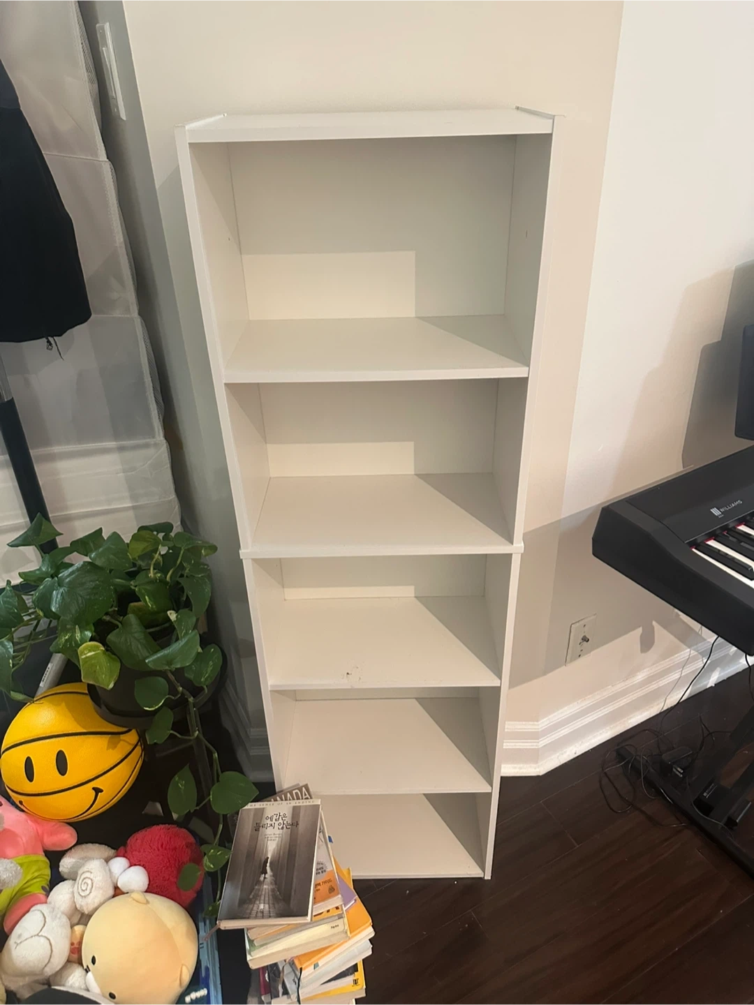 Selling a white bookcase with 5 shelves! It's in good condition, perfect for storing books, displaying decor, or organizing any room. There are a few minor signs of use, but overall it's sturdy and functional