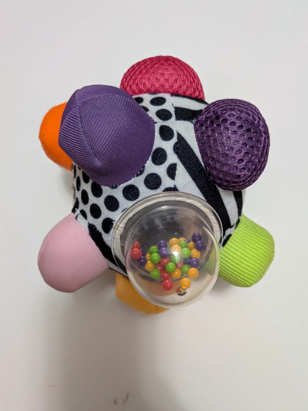 Selling a Sassy Whoobee rattle ball toy! It's in great condition and features a variety of textures and colours to stimulate your baby's senses. The clear plastic dome with colourful beads inside makes a fun rattling sound when shaken