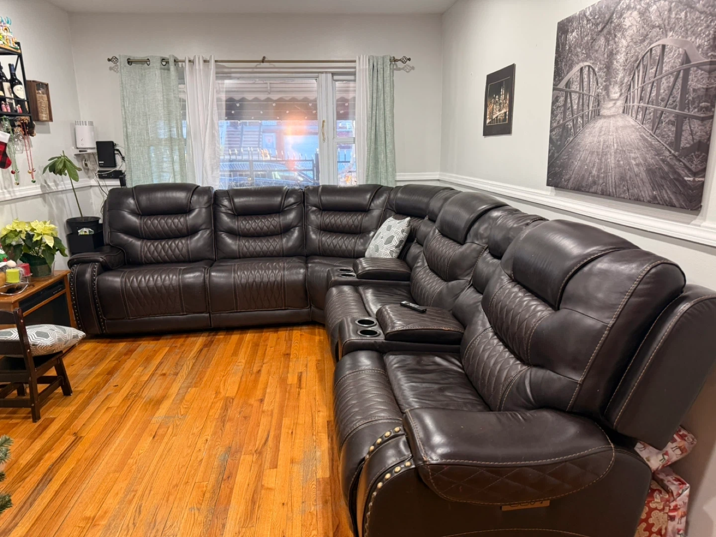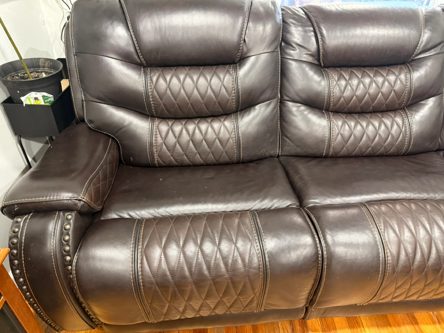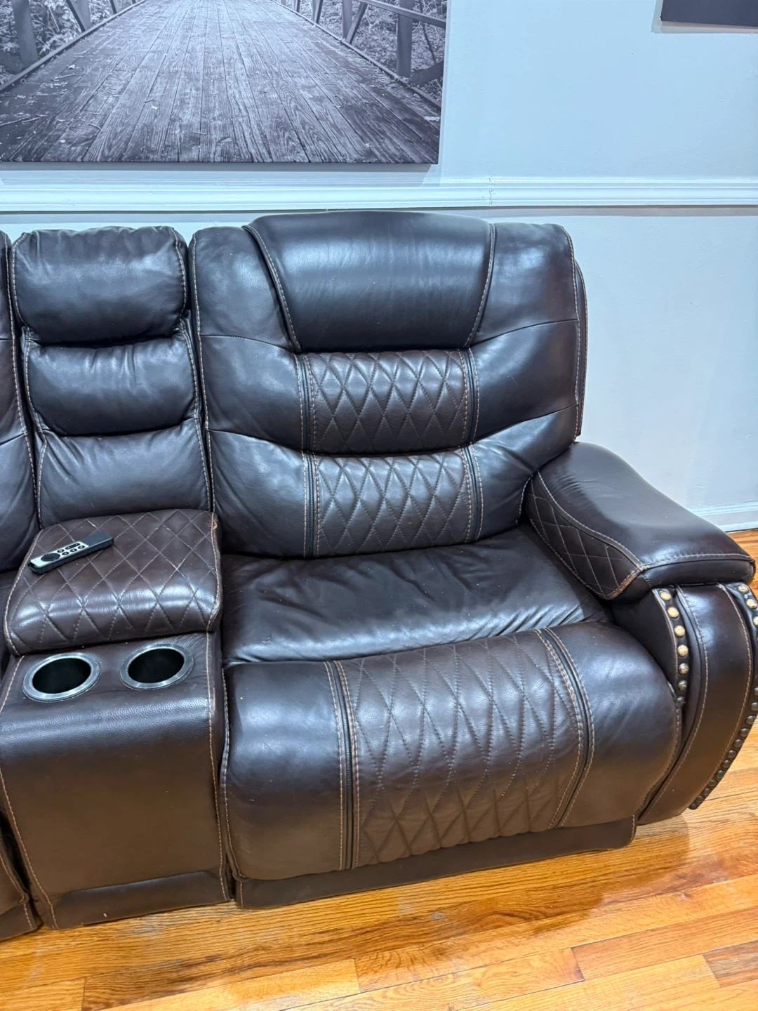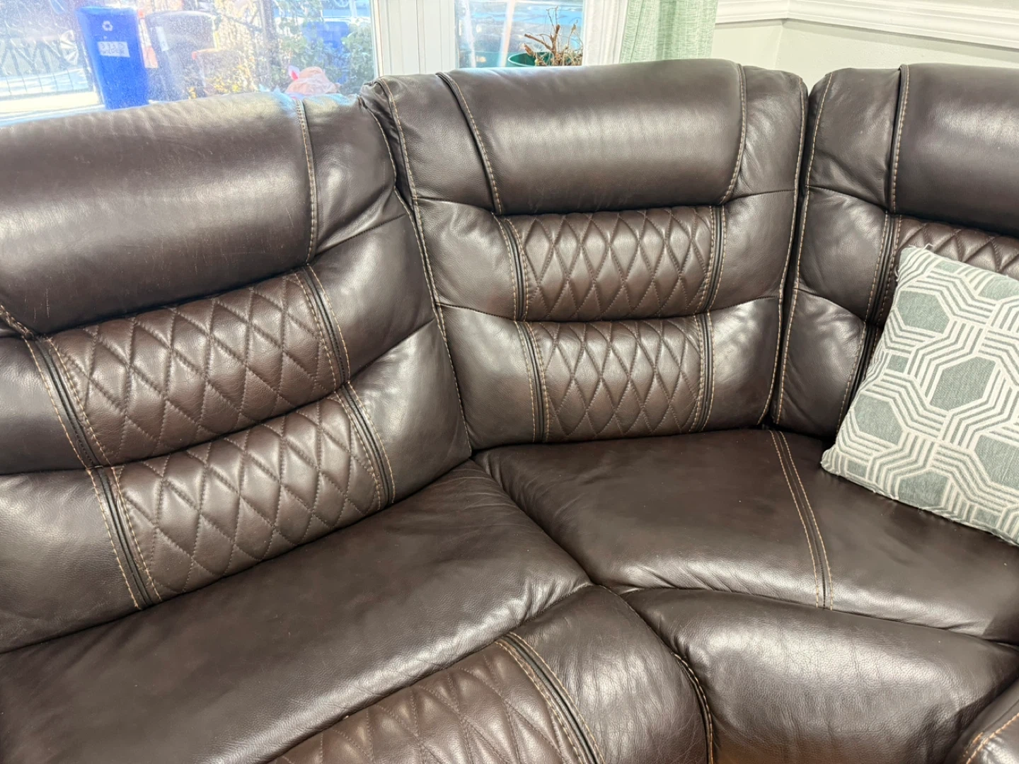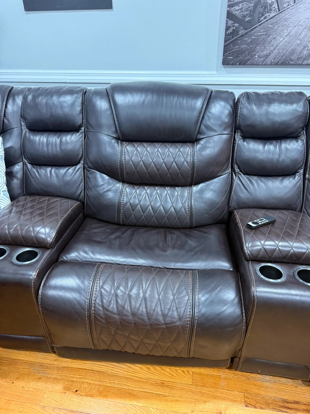 Selling a comfortable brown leather reclining sectional furniture It features a diamond-stitched pattern and built-in cup holders for added convenience. The furniture shows some signs of use but is still in good condition and ready to provide a relaxing seating experience!