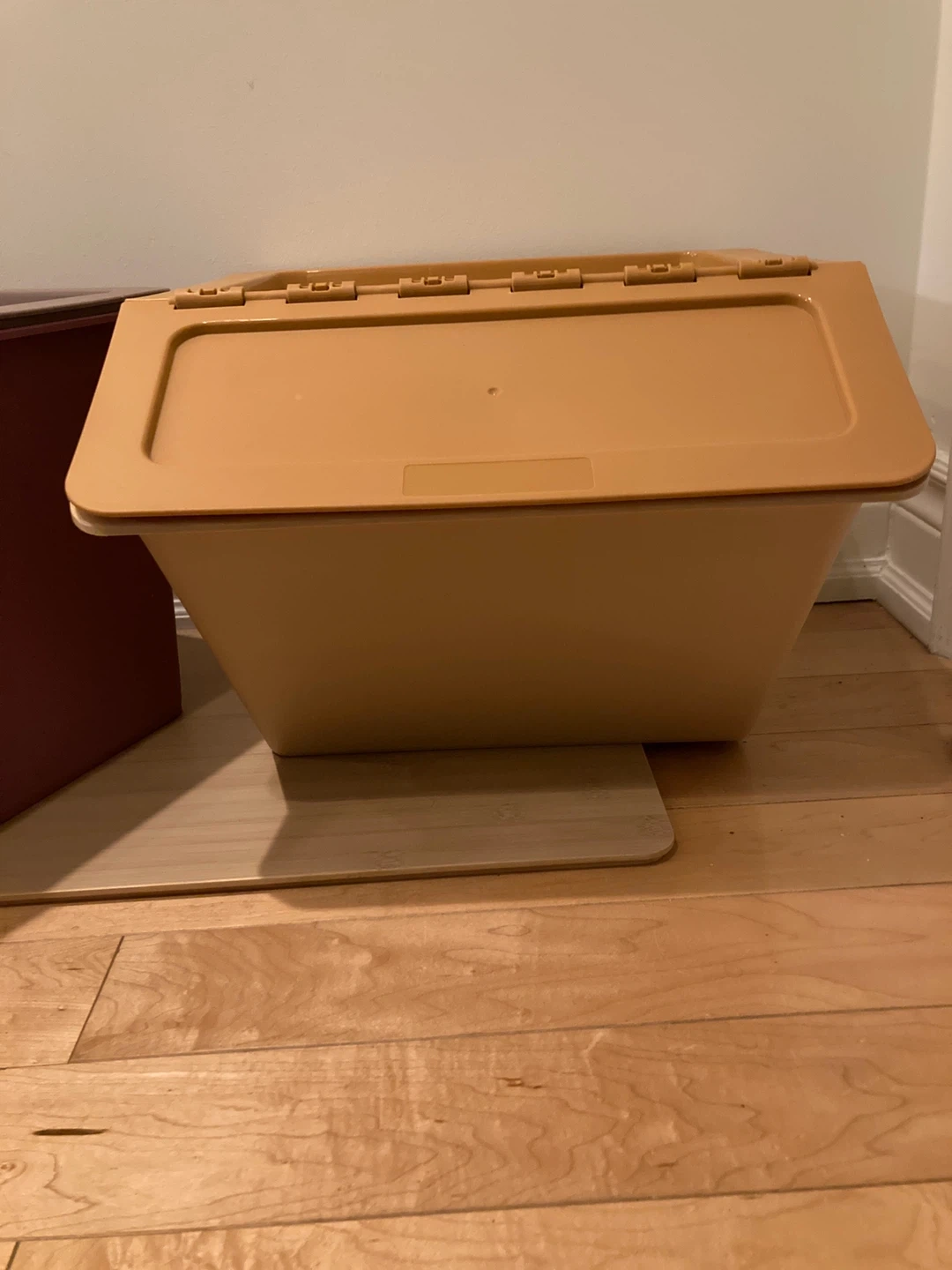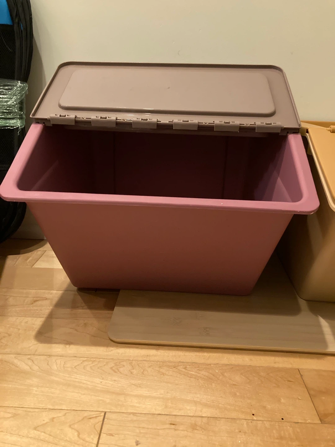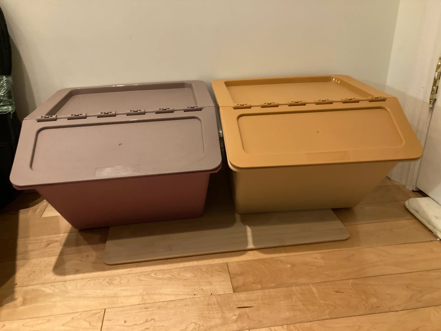 Selling a set of two storage bins with lids. One is a nice mauve colour, and the other is a tan colour. They're in great shape and ready to help you organize!