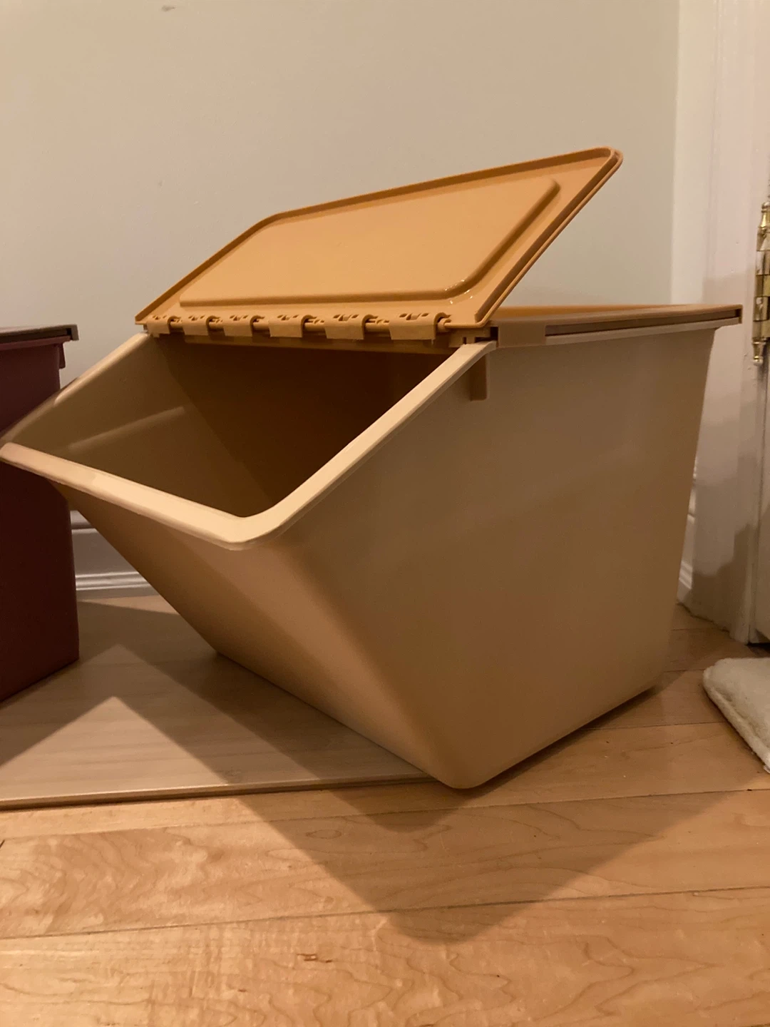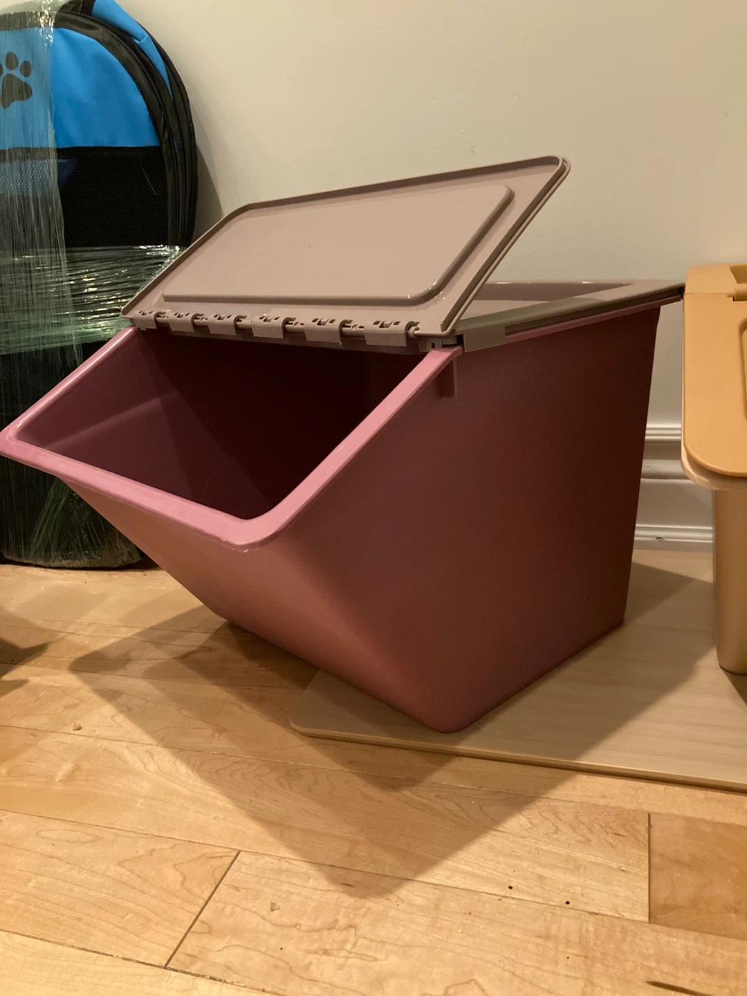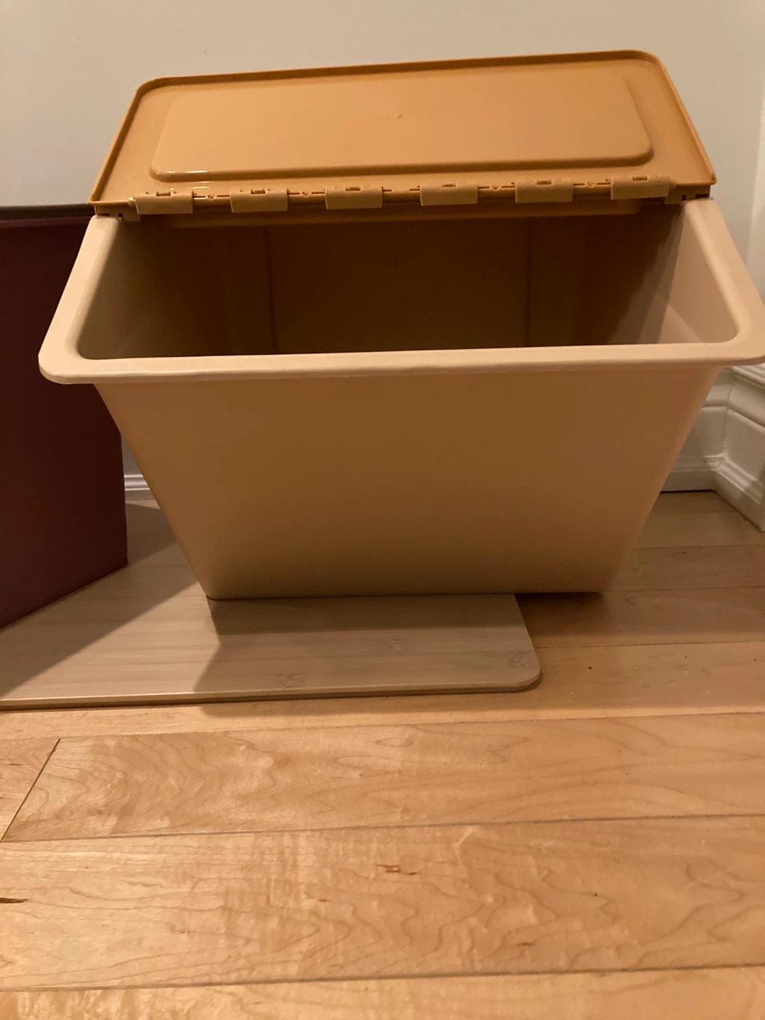 Selling a set of two storage bins with lids. One is a nice mauve colour, and the other is a tan colour. They're in great shape and ready to help you organize!