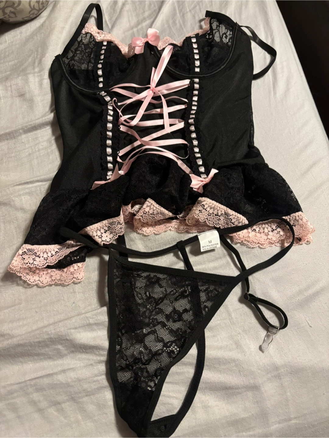 Cute black lace corset lingerie set in size medium! It features pink ribbon and lace detailing. Smoke free pet free home
