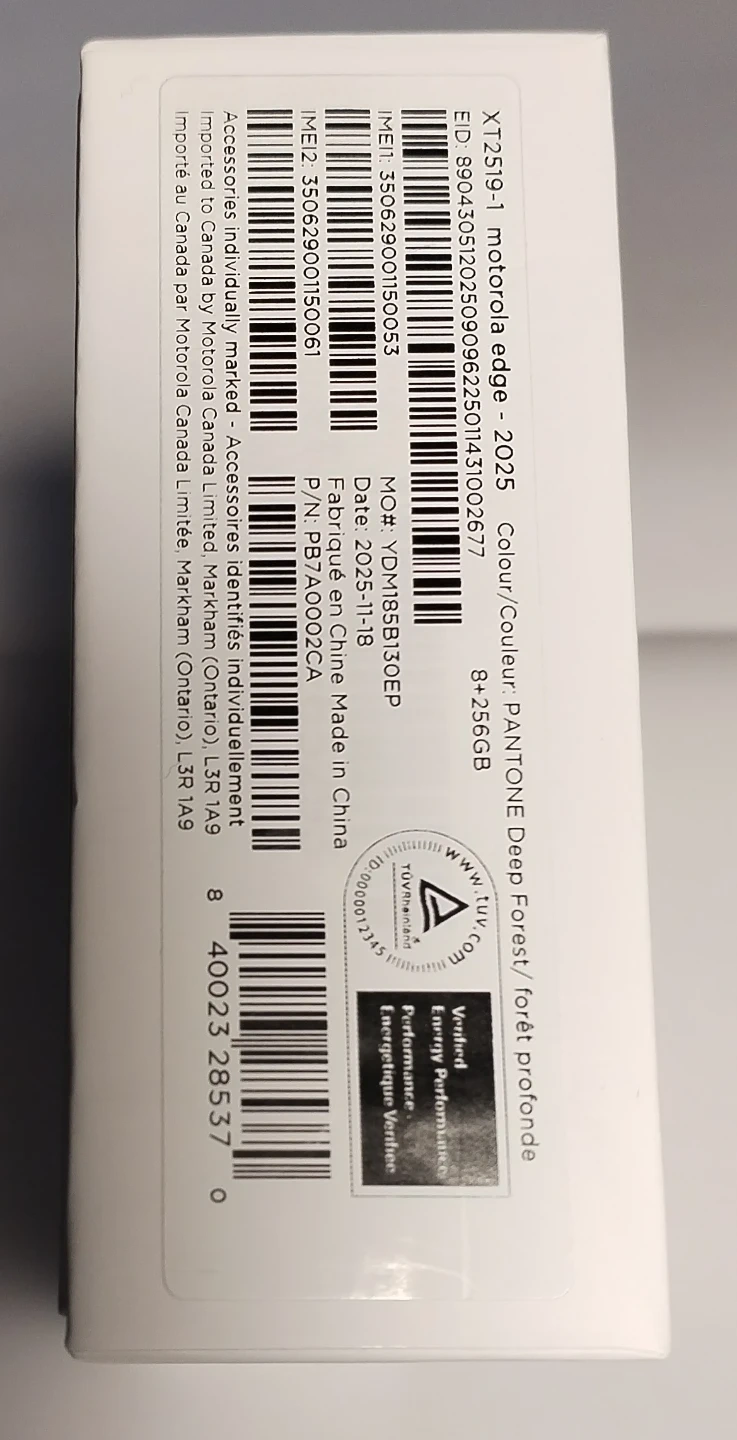 Included are the Motorola Edge 2025, cable, guides, and SIM tool. The colour is Pantone Deep Forest, and it has 256GB of storage. A great phone!