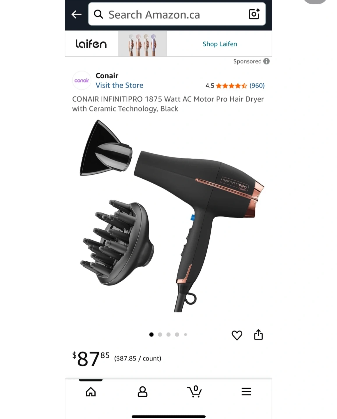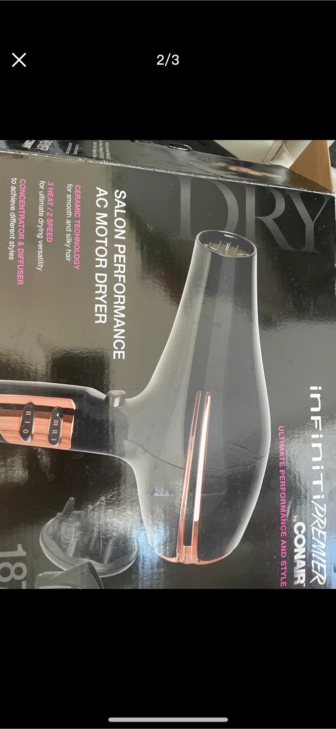 I'm selling a new Conair InfinitiPRO 1875 Watt AC Motor Pro Hair Dryer in black! It features ceramic technology for smooth and silky hair. The dryer has salon performance with 3 heat and 2 speed settings. It also comes with a concentrator and diffuser to achieve different styles. Originally bought for $87.85 and includes the box