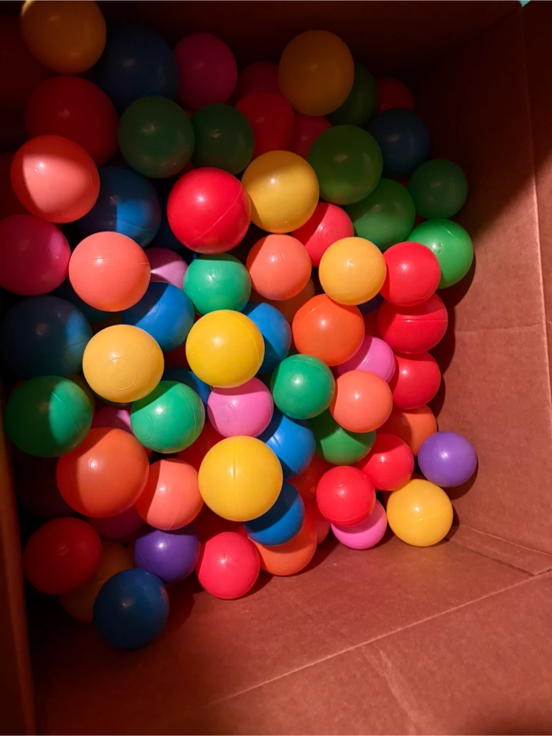 Selling a box of colourful plastic ball pit balls! These are perfect for a ball pit, play area, or just for fun. There's a variety of colours included in the box.
