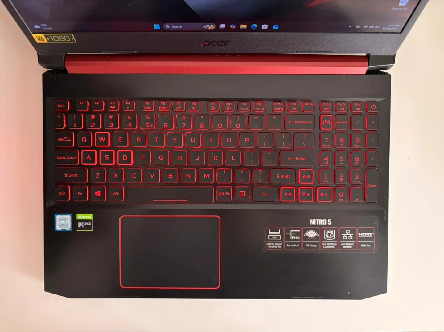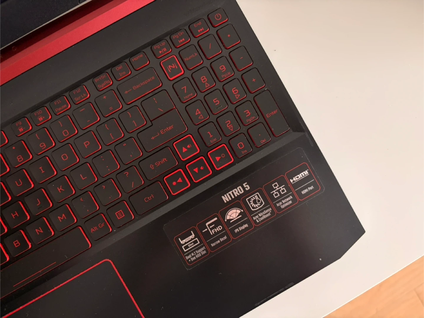 Selling an Acer Nitro 5 gaming laptop. It's in great condition and ready for a new owner! The keyboard has a cool red backlight.