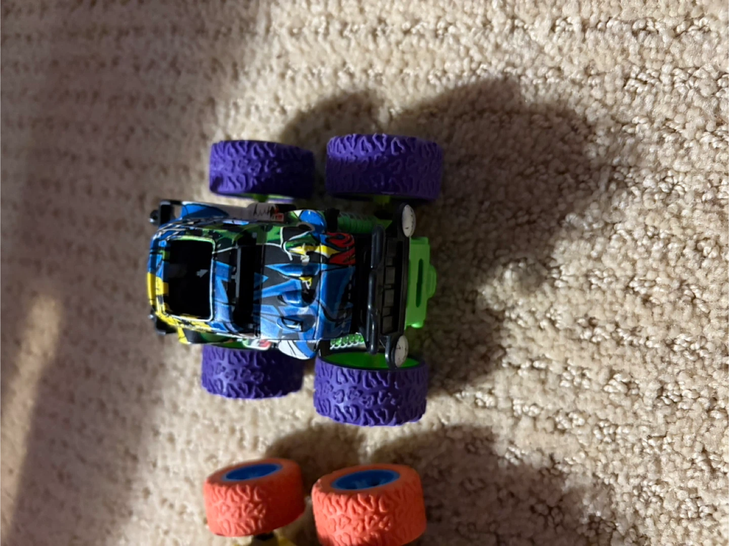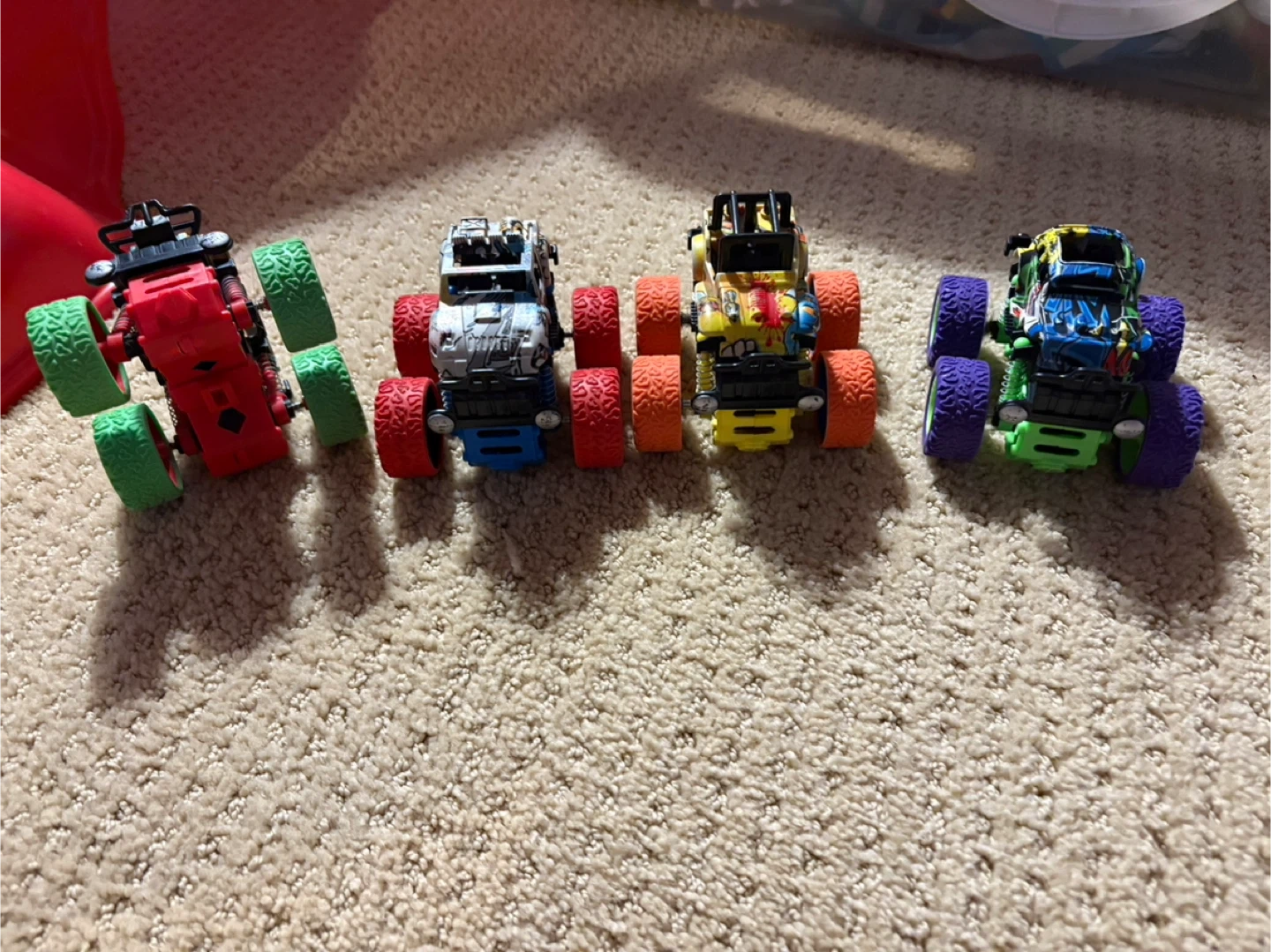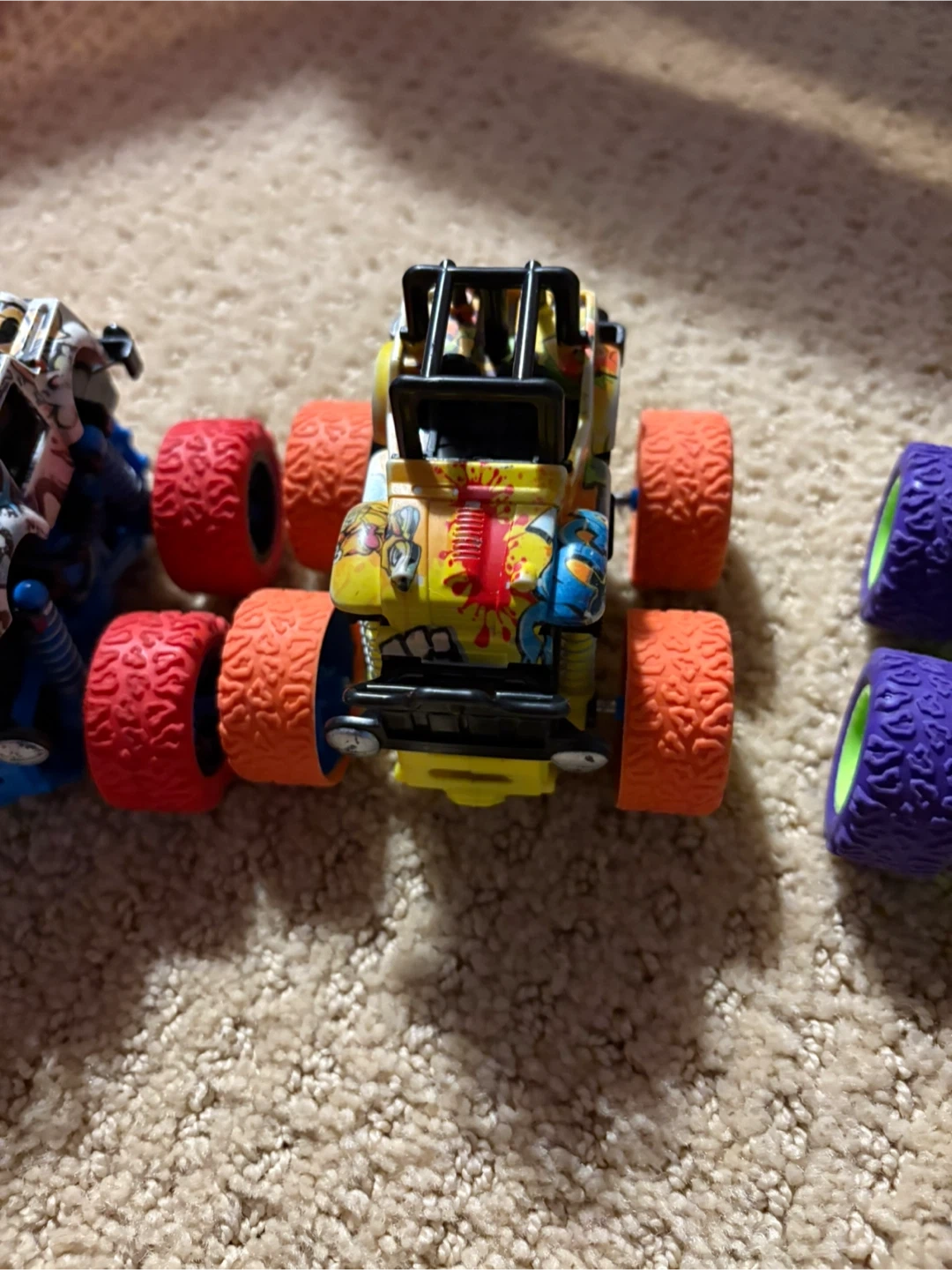 Selling a bundle of four monster truck toy cars! They each have unique designs and colourful wheels. Great for kids who love playing with cars