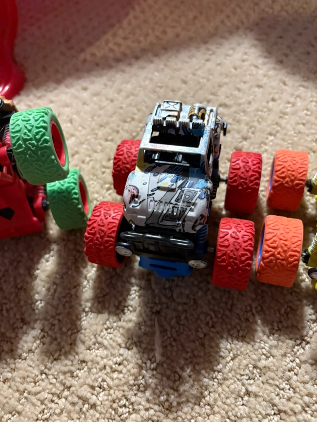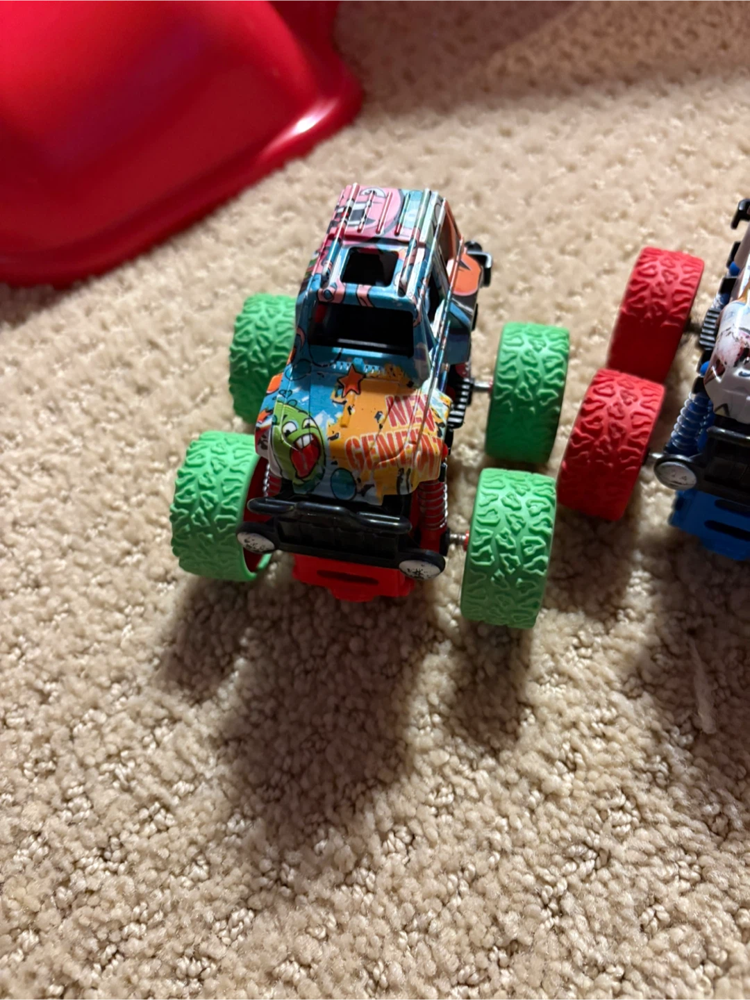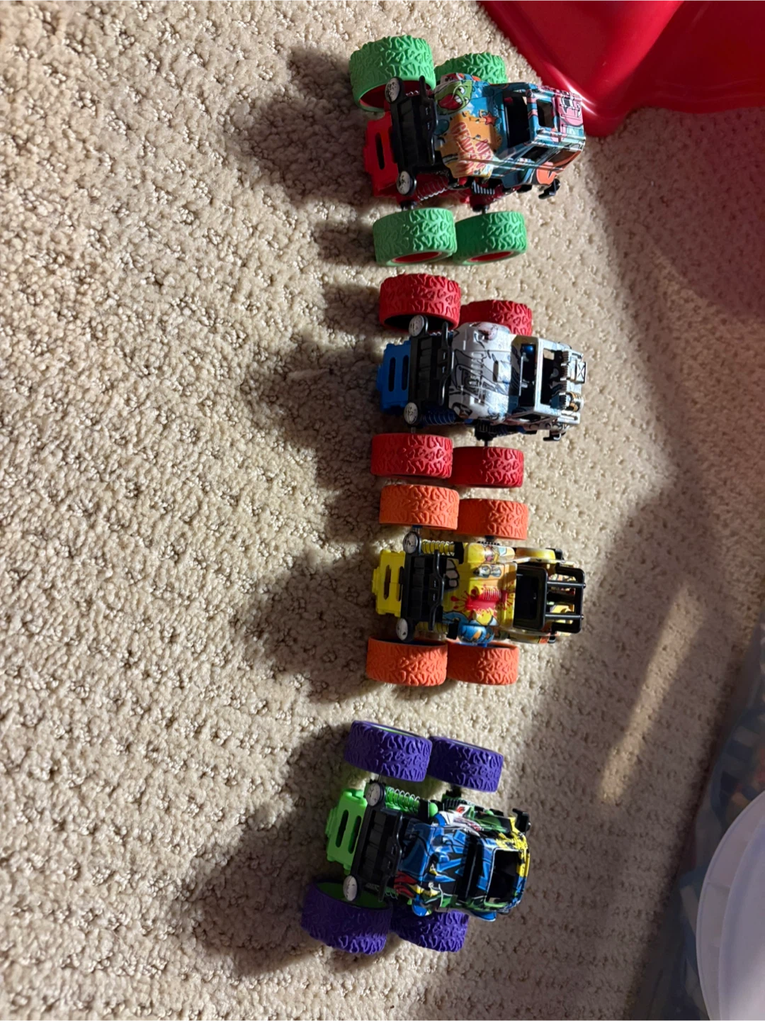 Selling a bundle of four monster truck toy cars! They each have unique designs and colourful wheels. Great for kids who love playing with cars