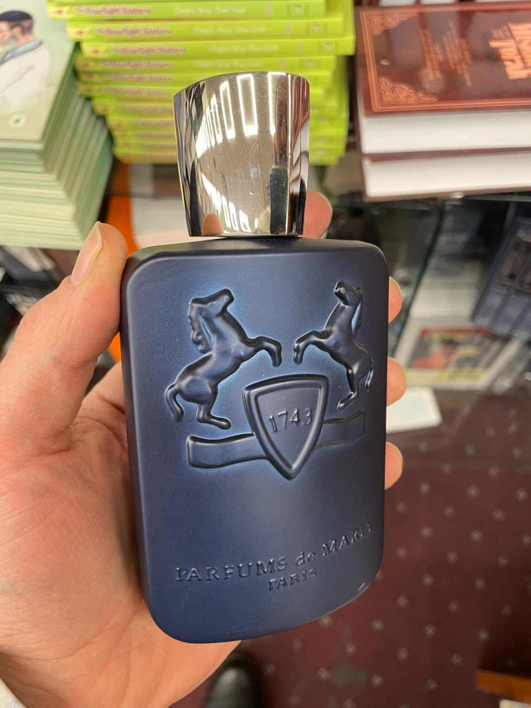 The bottle has a navy blue color and features the brand's logo with two horses and the year 1743. It's a beautiful fragrance! Strong and long lasting, 2 sprays enough for the whole day