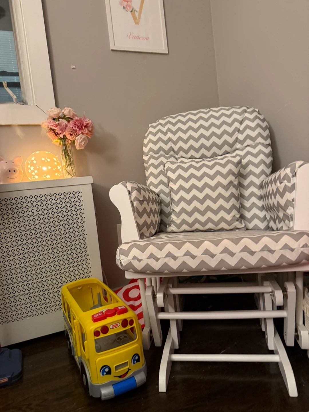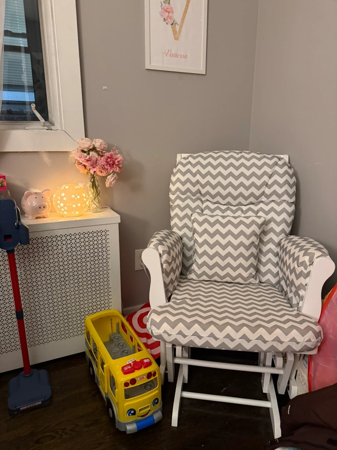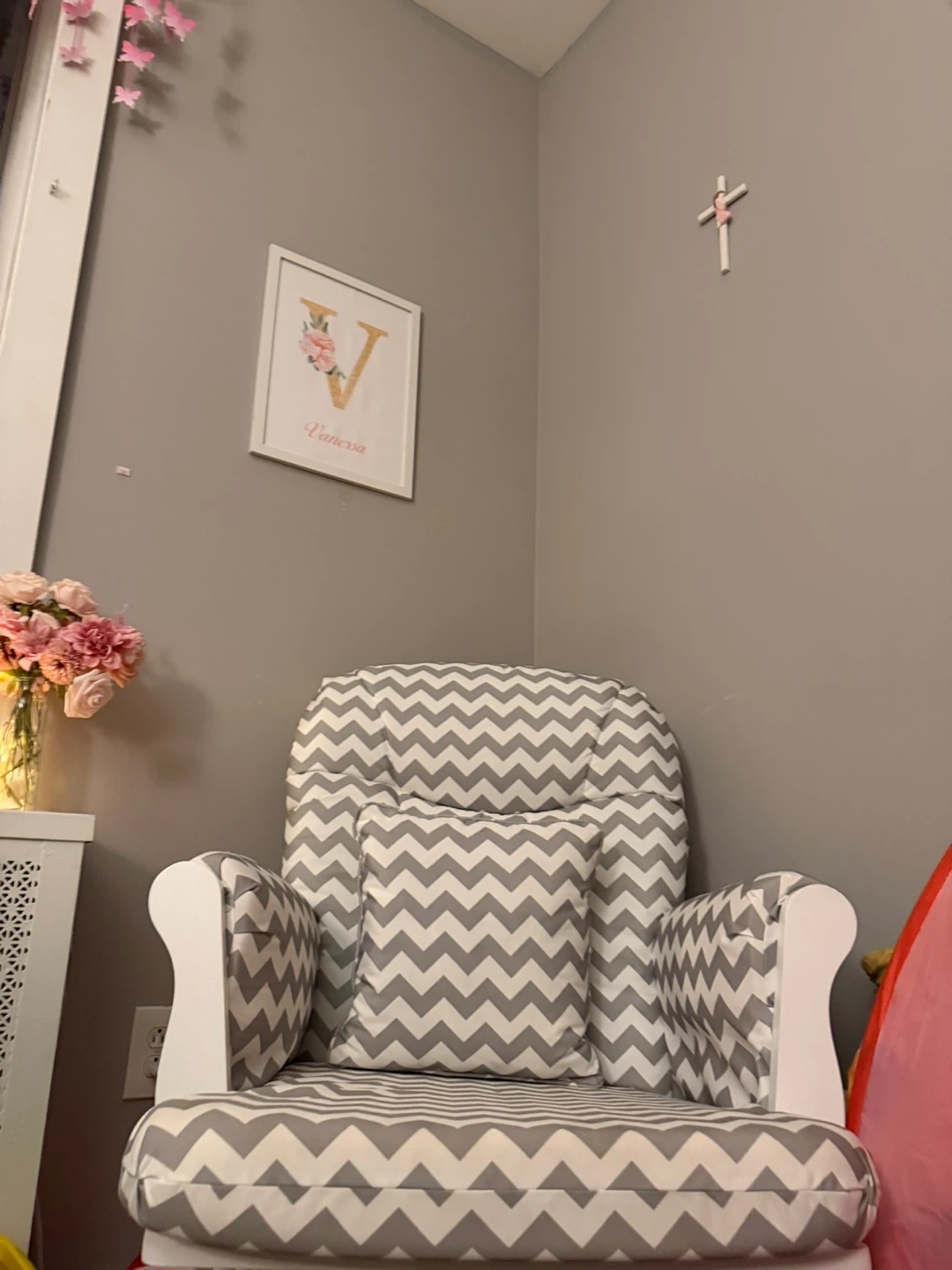 Selling a glider rocking chair with a white frame and gray chevron patterned cushions. It's in good condition and ready for a new home! Perfect for a nursery or any cozy corner of your house