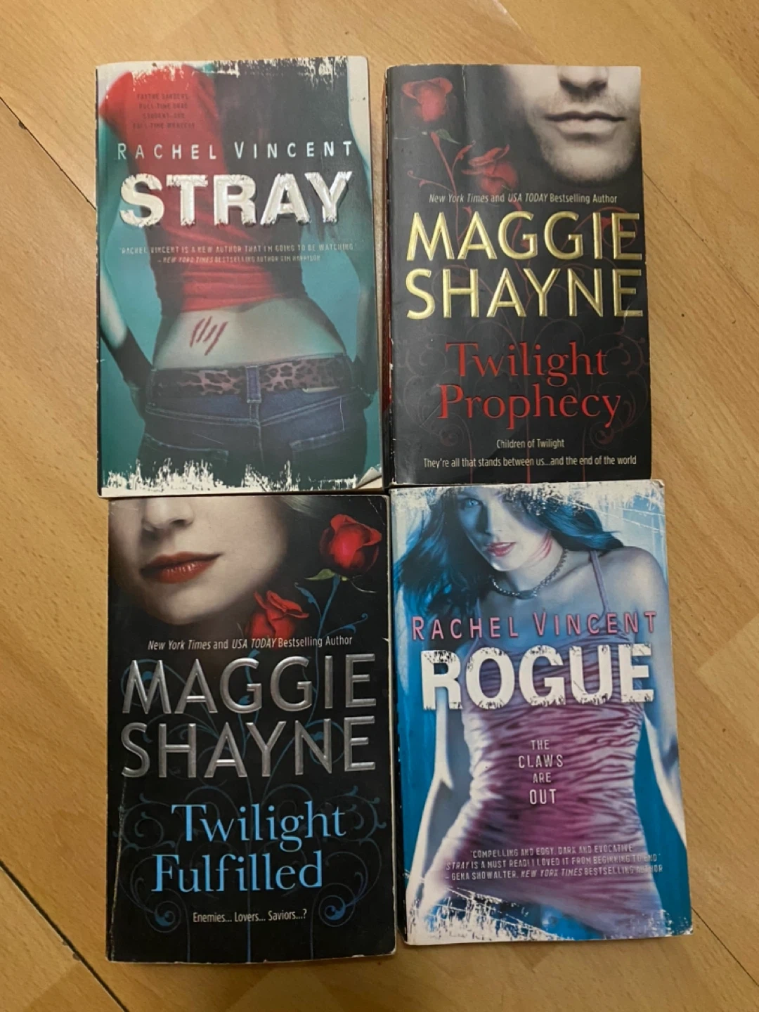 Selling a lot of four books by Rachel Vincent and Maggie Shayne. Titles include Stray, Rogue, Twilight Prophecy, and Twilight Fulfilled. Great for anyone who enjoys a good read!