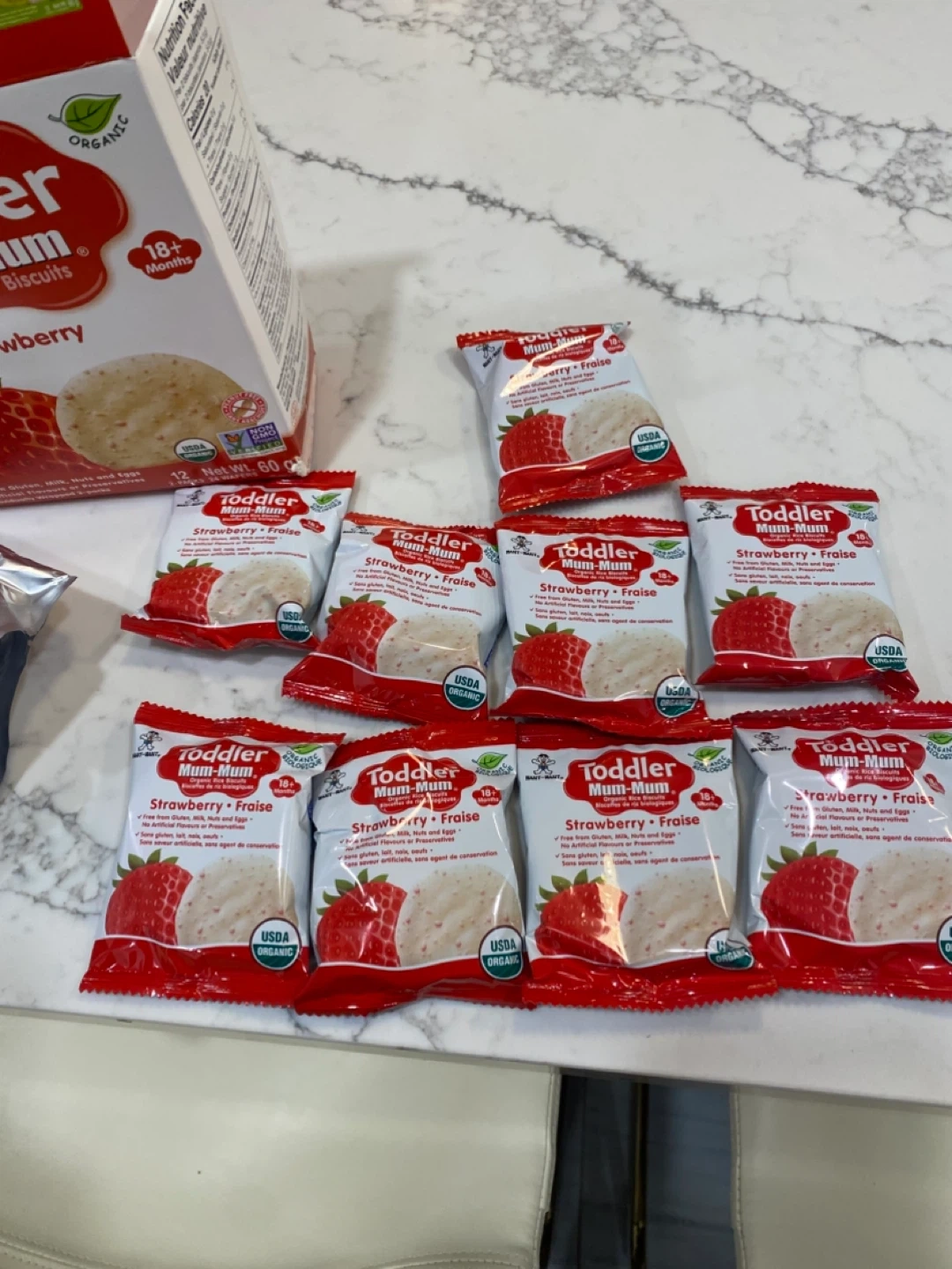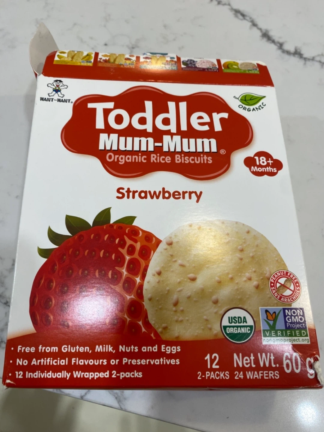 Toddler Mum-Mum Organic Rice Biscuits in Strawberry flavour, perfect for little ones aged 18+ months! They're free from gluten, milk, nuts, and eggs, with no artificial flavours or preservatives. They do contain gelatine. The box contains 9 of the 12 individually wrapped 2-packs of wafers. Expiry Date: 2026 October 10