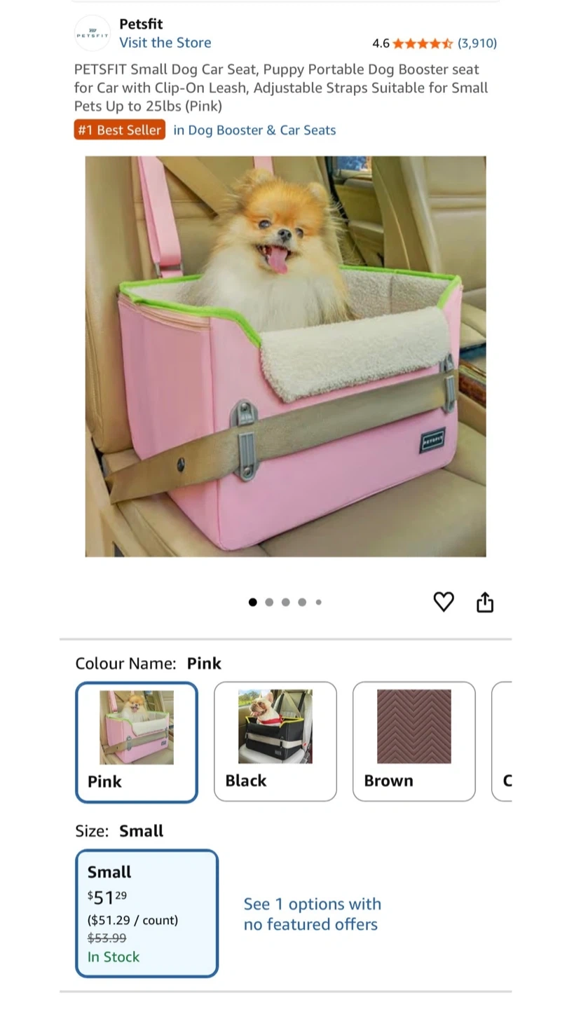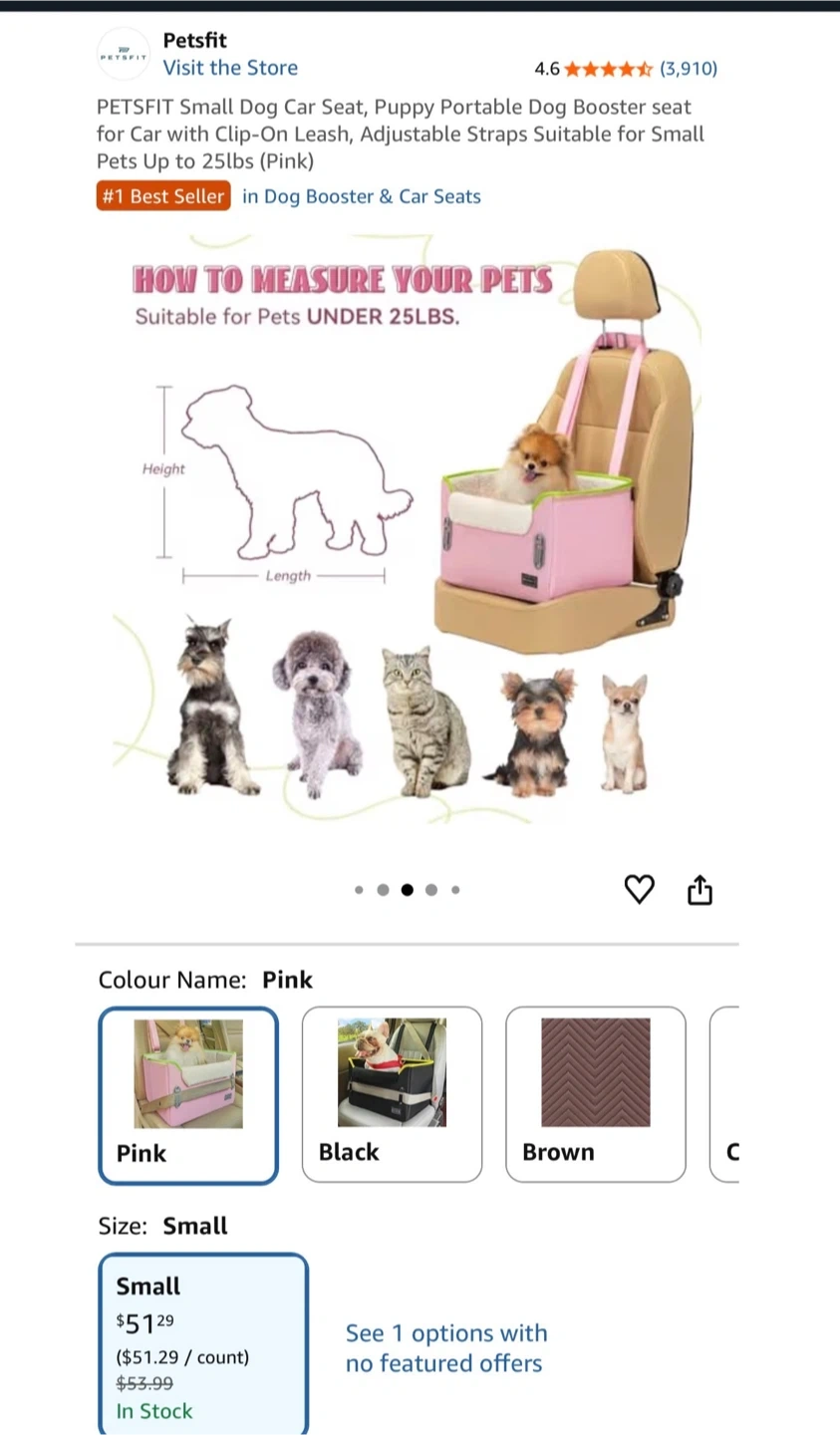 Keep your furry friend safe and comfy on car rides with this PETSFIT small dog car seat! It's pink and suitable for pets under 25lbs. This booster seat comes with a clip-on leash and adjustable straps.