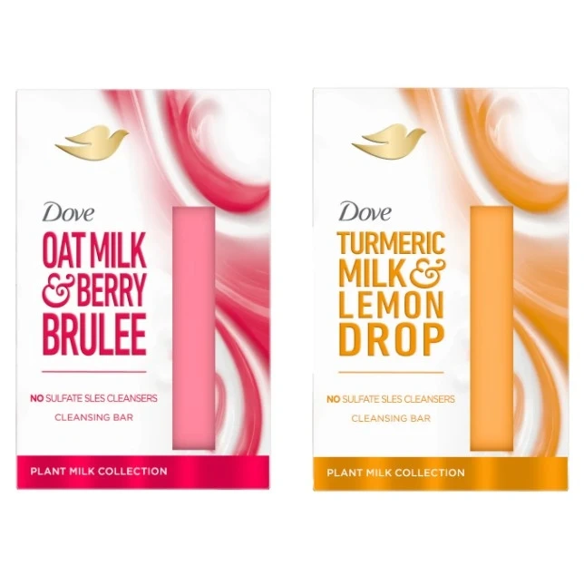 New Dove cleansing bars from the Plant Milk Collection, available in Oat Milk & Berry Brulee and Turmeric Milk & Lemon Drop scents. These bars offer a gentle, sulfate-free cleanse. Perfect for anyone seeking a nourishing and refreshing bathing experience.
