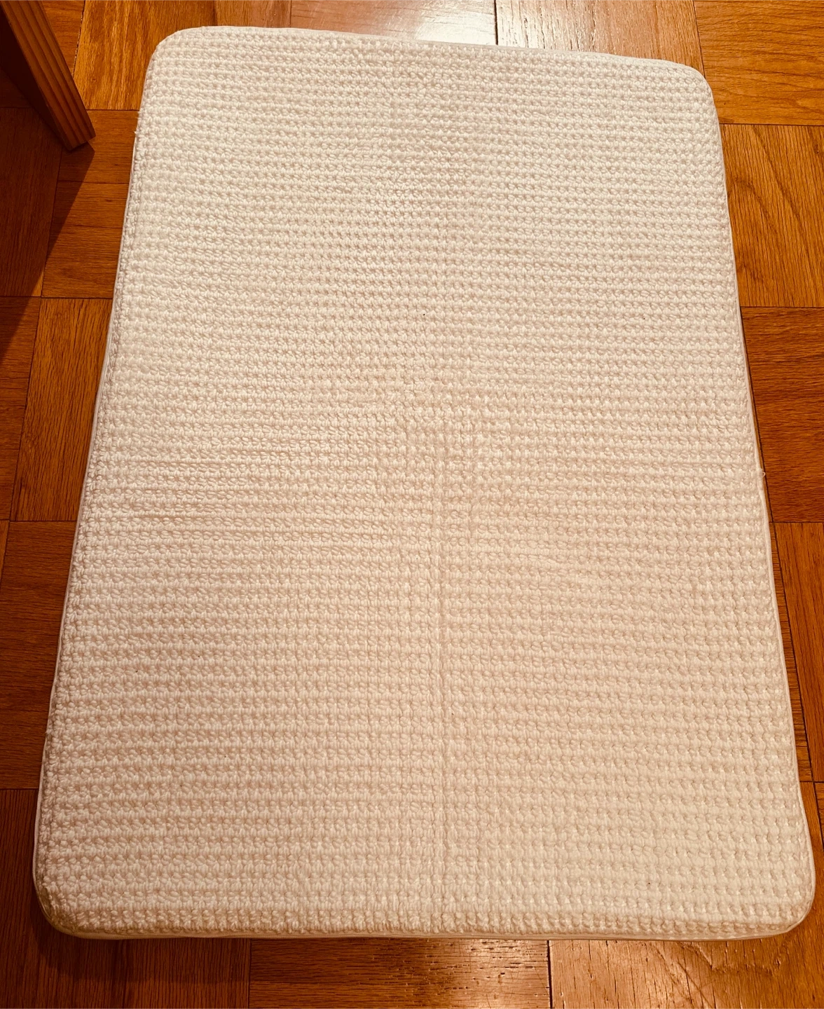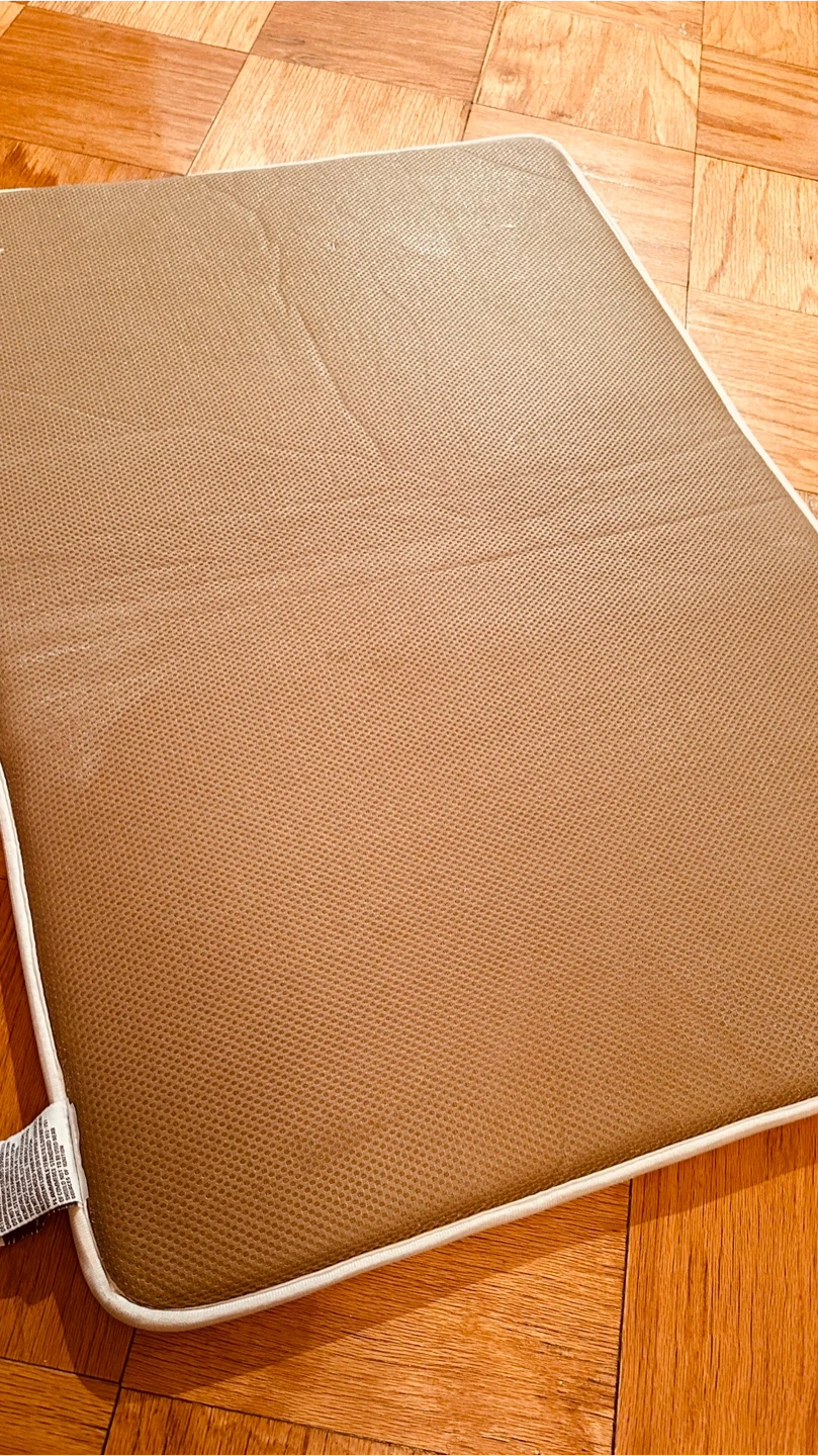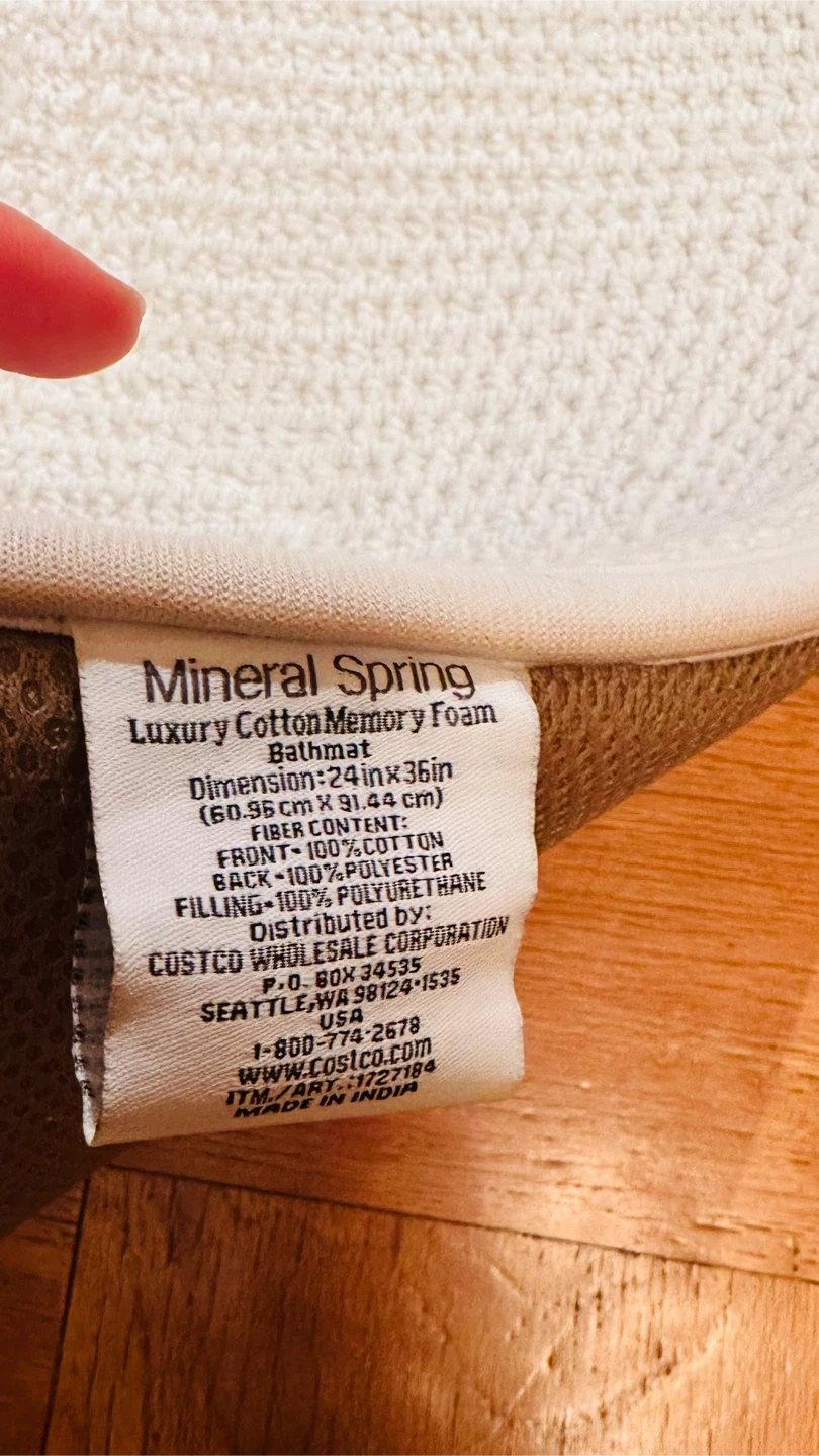 Selling a Mineral Spring luxury cotton memory foam bathmat. It's in great condition. The dimensions are 24 inches by 36 inches. The front is 100% cotton and the back is 100% polyester with 100% polyurethane filling