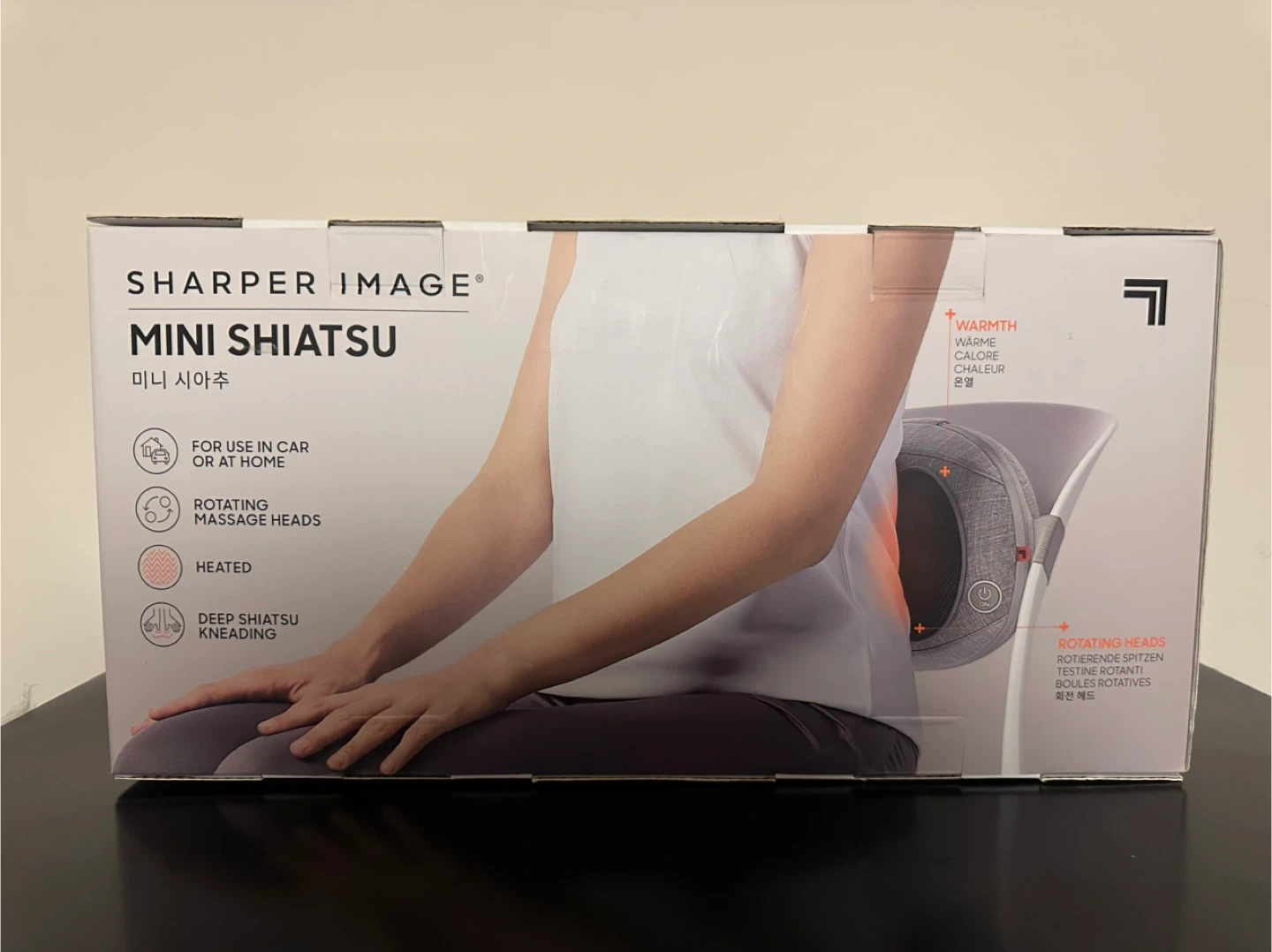 Selling a brand new Sharper Image Mini Shiatsu massager, still in its original box! It's designed for use in the car or at home and features rotating massage heads for deep shiatsu kneading. The box includes the massager, AC adapter, and car adapter